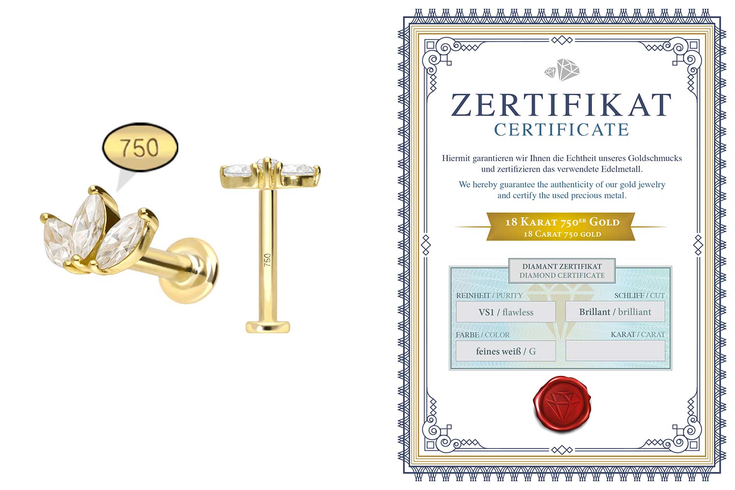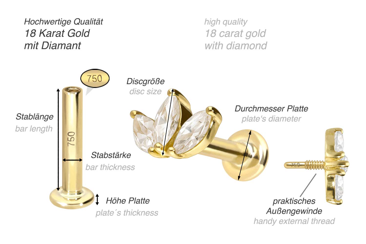 unten aufgeführten Stablängen erhältlich. Der Diamant verleiht dem Schmuckstück seinen außergewöhnlichen Glanz. Jeder Einzelne unserer Artikel aus Gold wird mit viel Liebe zum Detail in Handarbeit gefertigt und ist somit ein Unikat. Das 0,8 mm starke Innengewinde des Labrets ist mit allen Gold Produkten, die über ein solches Außengewinde verfügen, kompatibel, sodass sich vielfältige Kombinationsmöglichkeiten ergeben. Zusätzlich ist im Lieferumfang ein Echtheitszertifikat für den Diamanten enthalten.