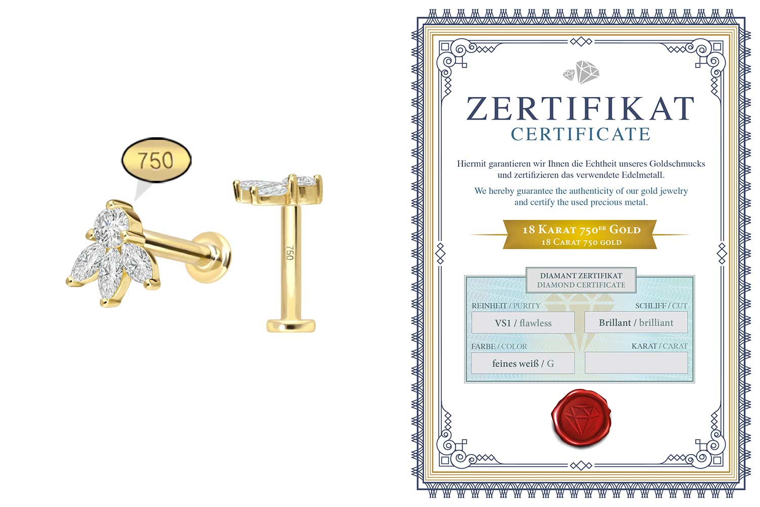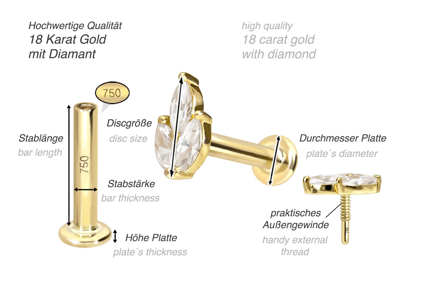 unten aufgeführten Stablängen erhältlich. Der Diamant verleiht dem Schmuckstück seinen außergewöhnlichen Glanz. Jeder Einzelne unserer Artikel aus Gold wird mit viel Liebe zum Detail in Handarbeit gefertigt und ist somit ein Unikat. Das 0,8 mm starke Innengewinde des Labrets ist mit allen Gold Produkten, die über ein solches Außengewinde verfügen, kompatibel, sodass sich vielfältige Kombinationsmöglichkeiten ergeben. Zusätzlich ist im Lieferumfang ein Echtheitszertifikat für den Diamanten enthalten.