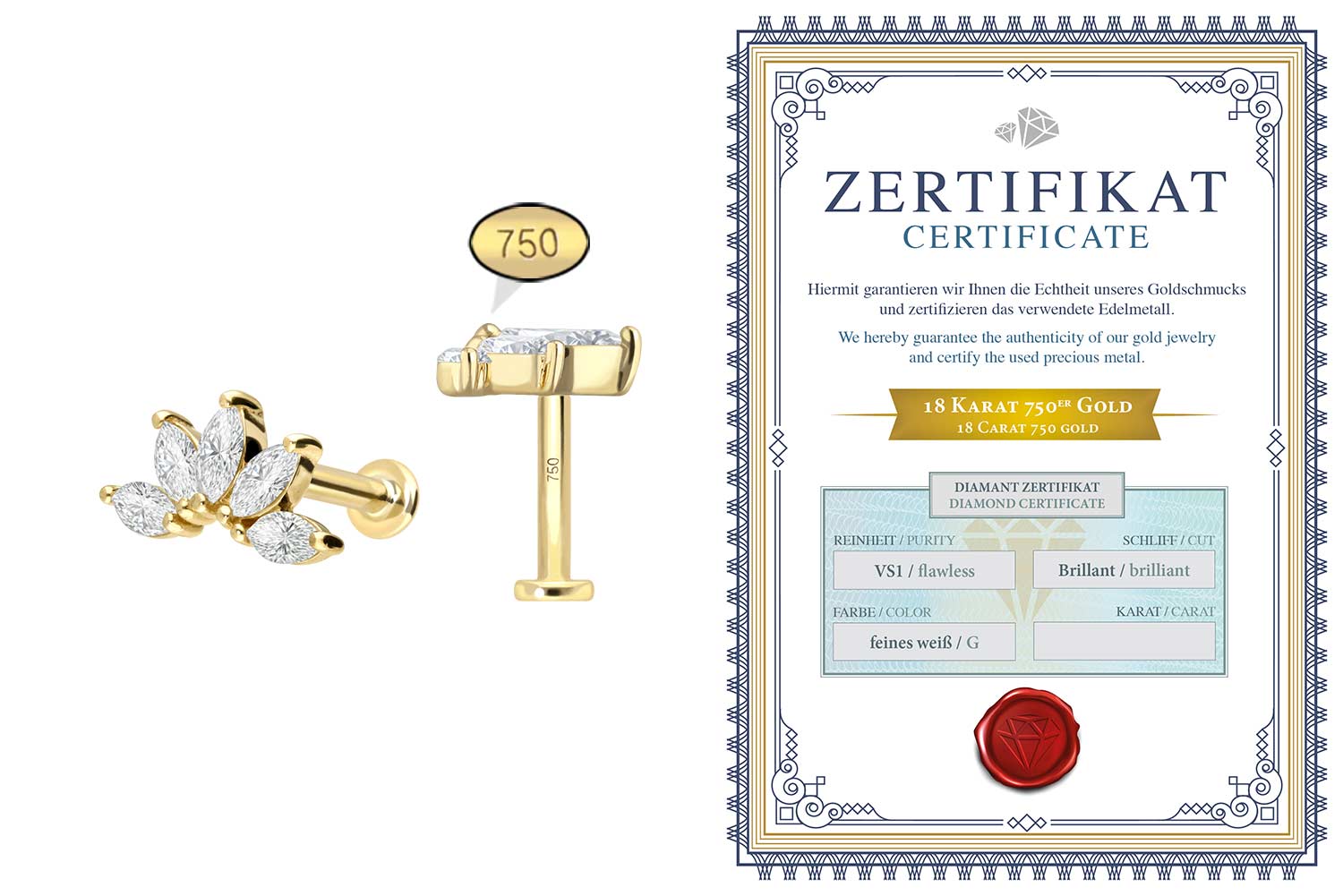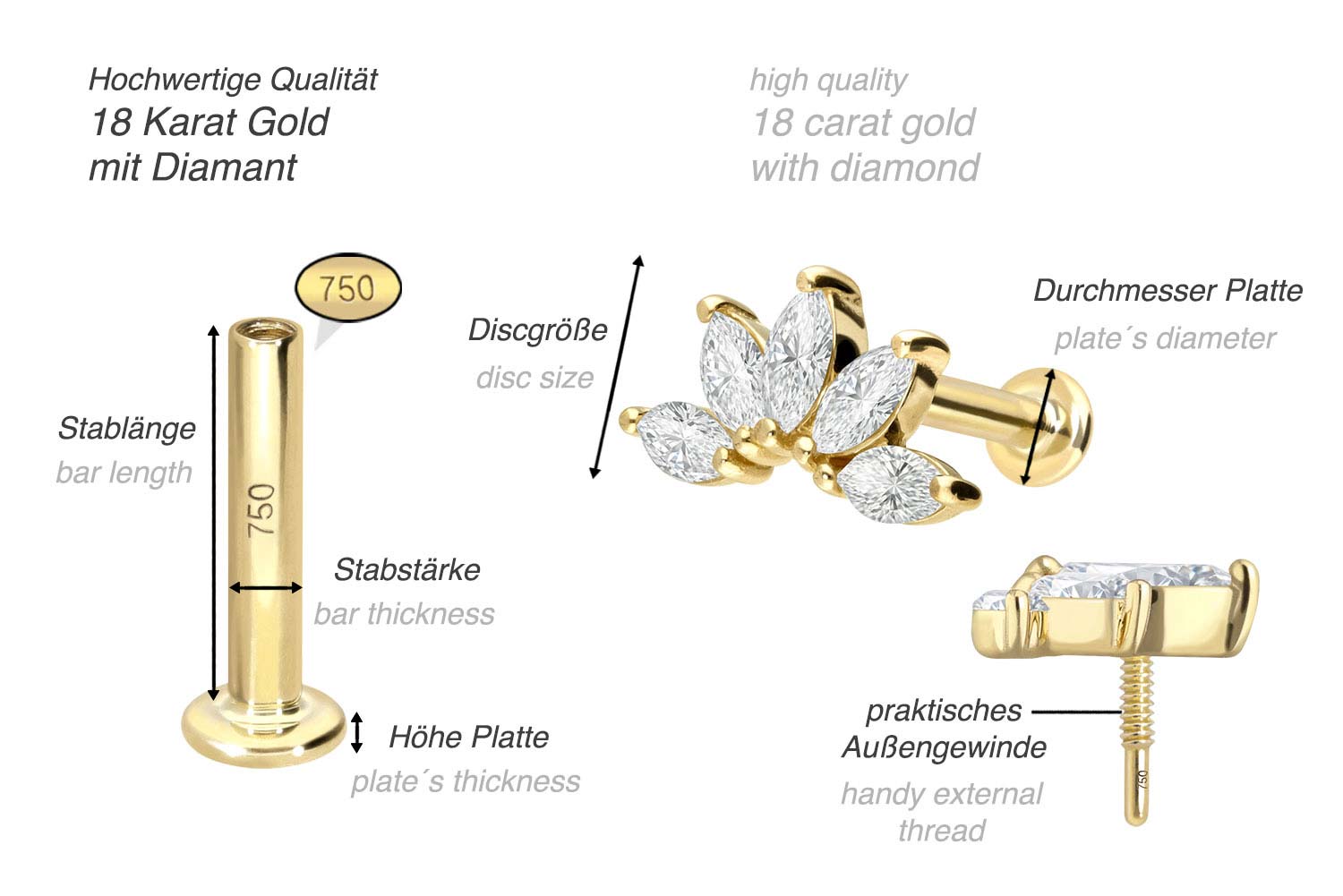 unten aufgeführten Stablängen erhältlich. Der Diamant verleiht dem Schmuckstück seinen außergewöhnlichen Glanz. Jeder Einzelne unserer Artikel aus Gold wird mit viel Liebe zum Detail in Handarbeit gefertigt und ist somit ein Unikat. Das 0,8 mm starke Innengewinde des Labrets ist mit allen Gold Produkten, die über ein solches Außengewinde verfügen, kompatibel, sodass sich vielfältige Kombinationsmöglichkeiten ergeben. Zusätzlich ist im Lieferumfang ein Echtheitszertifikat für den Diamanten enthalten.