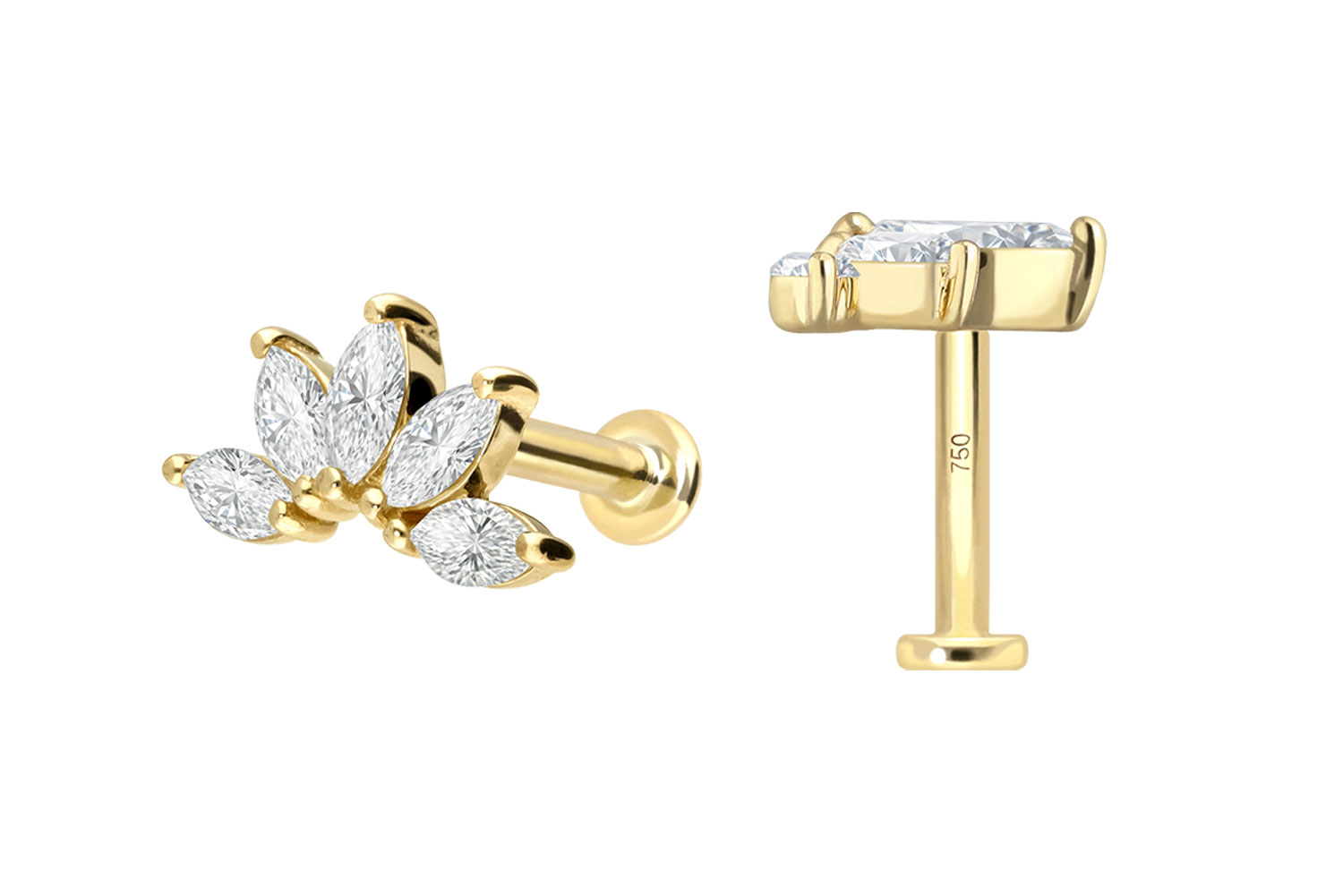 Dieses Labret ist mit Ausnahme der Diamanten vollständig aus hochwertigem 18 Karat (750er) Gelbgold gefertigt, das neben seiner exzellenten Qualität auch mit Eigenschaften wie guter Hautverträglichkeit und hoher Beständigkeit zu begeistern weiß. Das Labret verfügt über einen zeitlos schönen Schraubaufsatz mit Außengewinde in Form einer Lotusblüte, hat