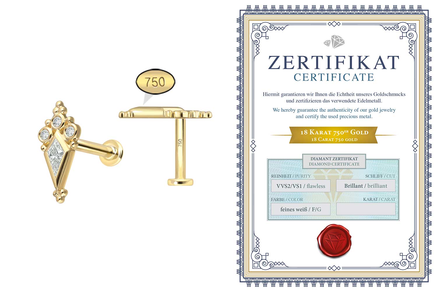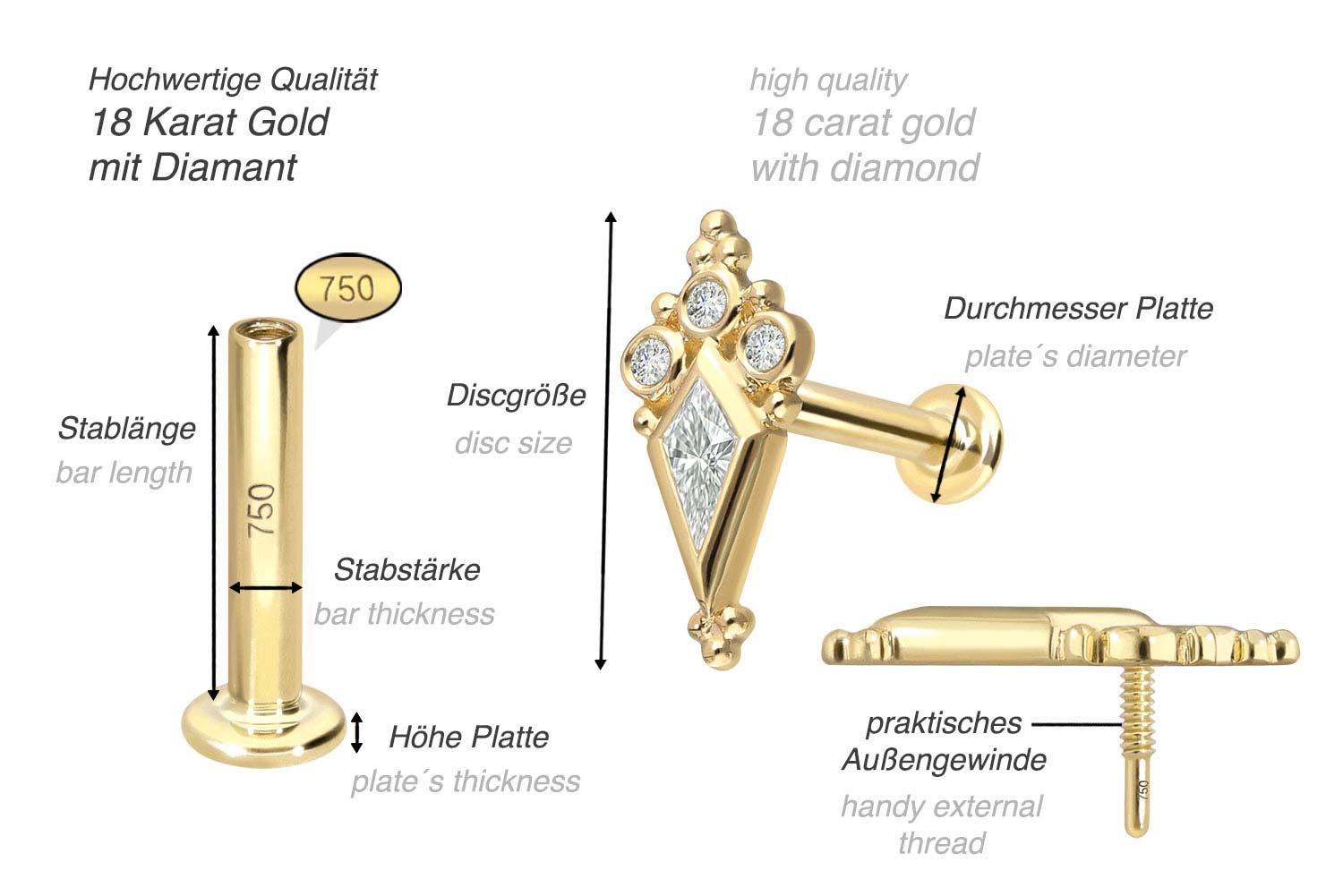 18 Karat Gold - Labret mit Innengewinde Diamant-Schild