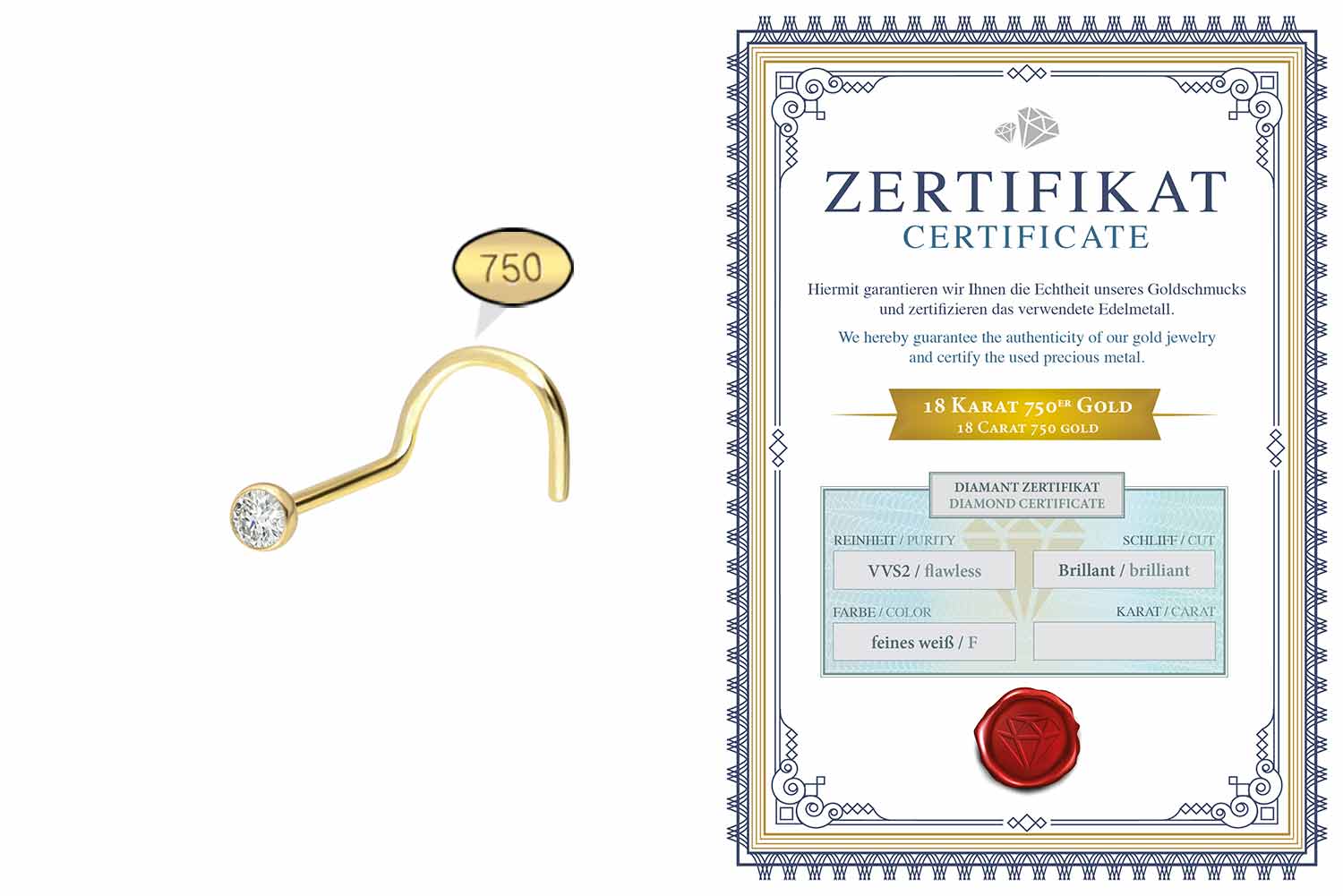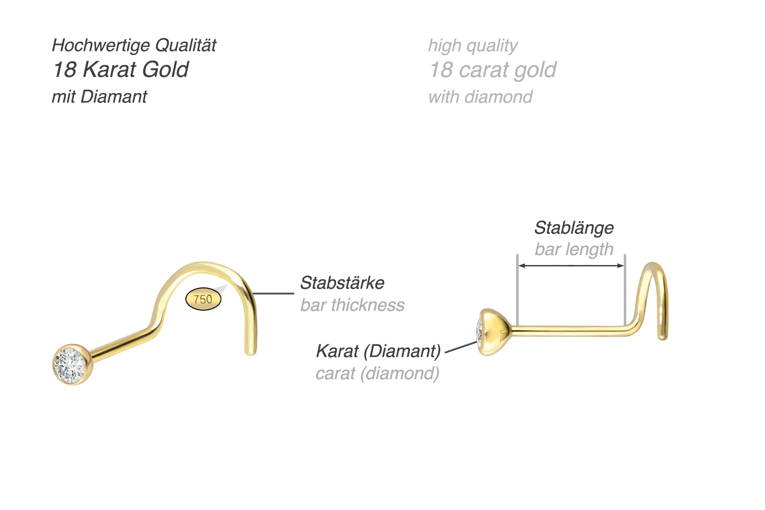 Dieser Nasenstecker besteht mit Ausnahme des Diamanten vollständig aus hochwertigem 18 Karat (750er) Gold, das neben seiner exzellenten Qualität auch mit Eigenschaften wie guter Hautverträglichkeit und hoher Beständigkeit zu begeistern weiß. Der Diamant verleiht dem Schmuckstück seinen außergewöhnlichen Glanz. Jeder Einzelne unserer Artikel aus Gold wird mit viel Liebe zum Detail in Handarbeit gefertigt und ist somit ein Unikat. Dank des spiralförmigen Stabes dieses Schmuckstücks wird ein besonders fester Halt in der Nase gewährleistet. Es verfügt stets über eine Stabstärke von 0,6 mm, wohingegen die Stablänge 6 mm beträgt.