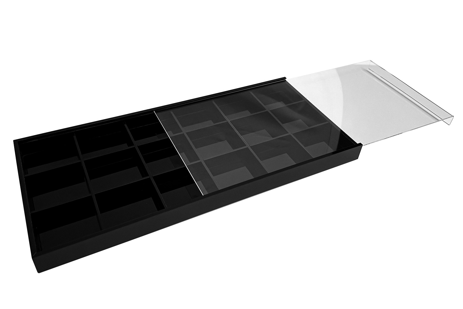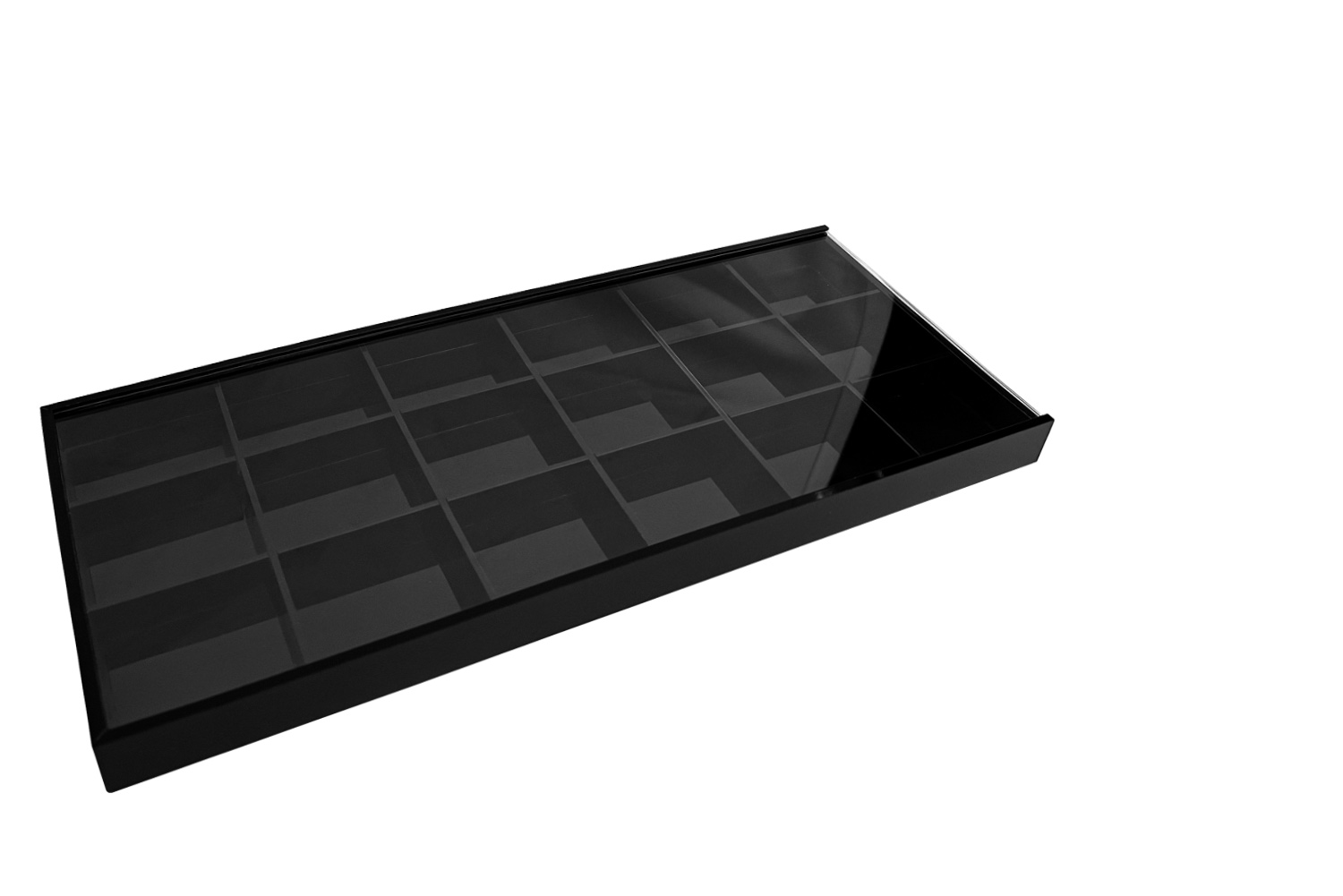 Dieses Display ist aus hochwertigem Acryl gefertigt. Seine längliche Form bietet Platz für Accessoires und Kugeln in 18 Fächern. Die schlichte schwarze Oberfläche macht das Display zu einer eleganten Möglichkeit, die Produkte auf dem Tresen oder auch in einer Vitrine vorzuführen und aufzubewahren. Durch den aufschiebbaren, transparenten Deckel können keine Artikel verloren gehen und auch ohne Aufschieben betrachtet werden.