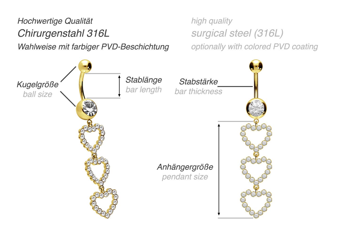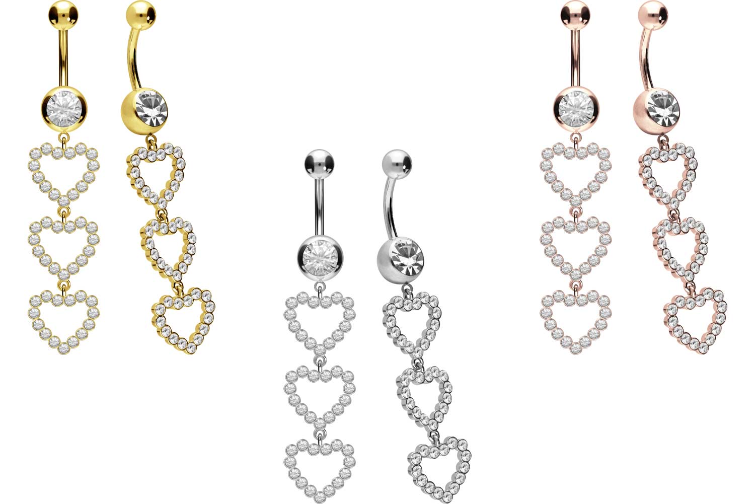 Chirurgenstahl 316L - Bauchnabelpiercing 3 Kristallherzen