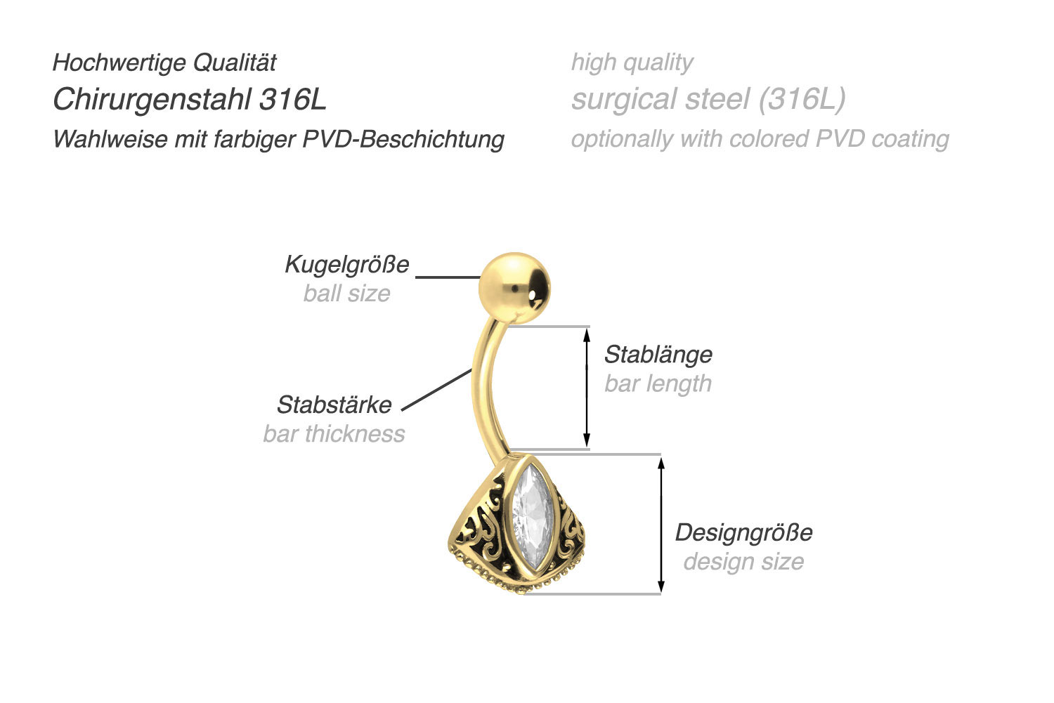 Dieses Bananabell ist aus hochwertigem Chirurgenstahl 316L gefertigt, der je nach gewünschter Farbe mit einer kratzfesten PVD-Beschichtung versehen ist. Zu den Materialeigenschaften von Chirurgenstahl 316L gehören neben hoher Qualität auch ebene Beschaffenheit sowie hohe Beständigkeit. Die obere Kugel kann abgeschraubt werden, während das untere Design, welches aus einem Kristalltropfen und einem Fächer besteht, fest mit dem Bananabell verbunden ist. Das Bauchnabelpiercing hat eine Stabstärke von 1,6 mm und ist mit einer Stablänge von 10 mm erhältlich.
