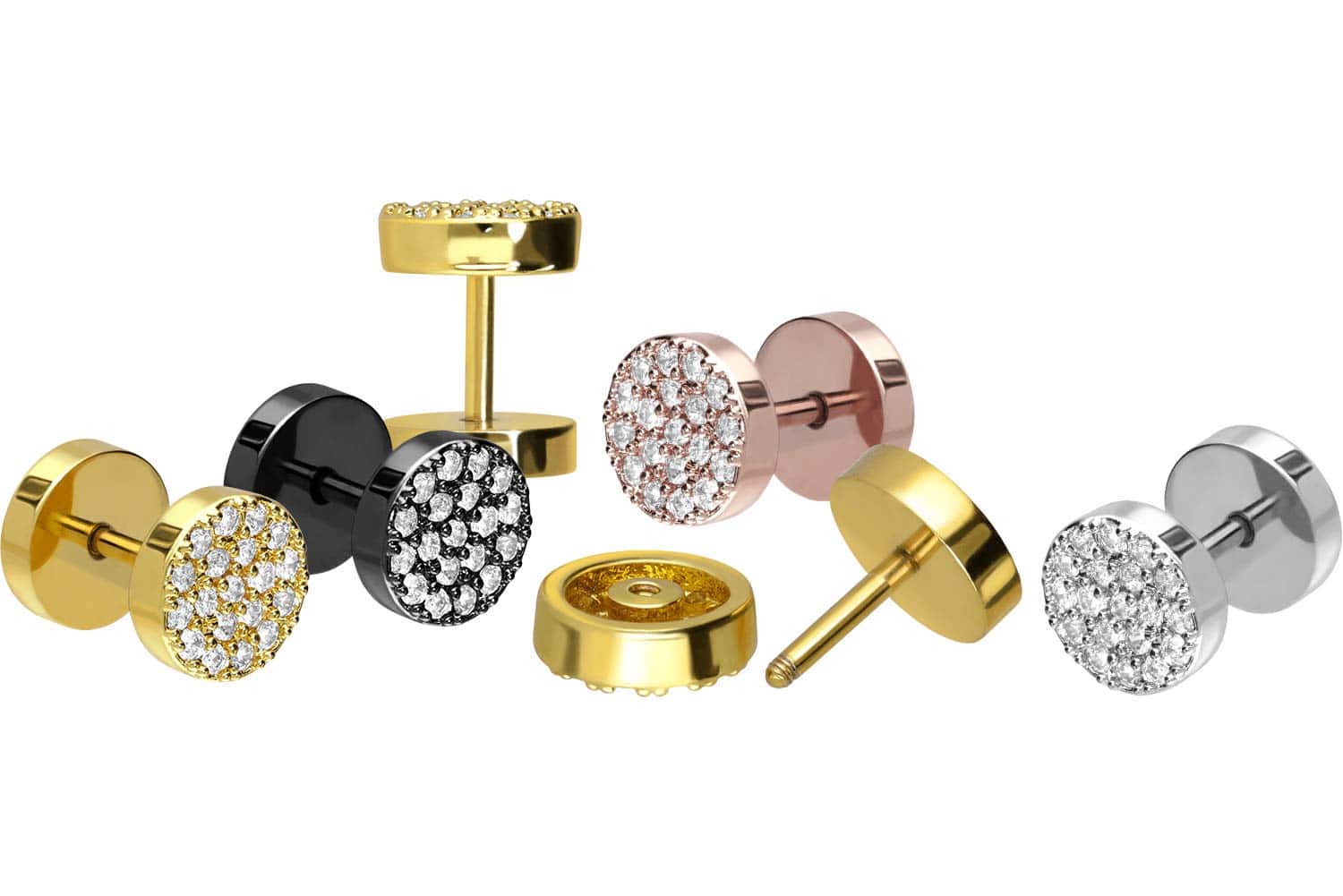 Dieser funkelnde Fake Plug besteht hauptsächlich aus hochwertigem Chirurgenstahl 316L, zu dessen spezifischen Materialeigenschaften unter anderem hohe Beständigkeit und ebene Beschaffenheit gehören. Wohingegen die vordere mit zahlreichen Kristallen besetzte Disc aus Messing gefertigt wurde. Falls gewünscht, sorgt zudem eine kratzfeste PVD-Beschichtung für eine kräftige Farbe nach Wahl. Dieses Schmuckstück verfügt stets über eine Stabstärke von 1,2 mm sowie eine Stablänge von 6 mm und ist mit einer Discgröße von 8 mm erhältlich.