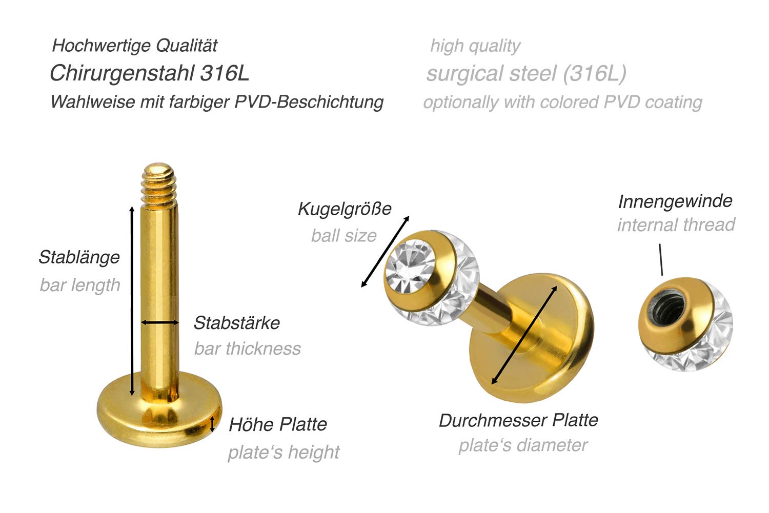 die abgeschraubt werden kann. Neben einem mittig platzierten größeren Kristall ist sie auch mit einem Ring aus kleineren Kristallen versehen, deren Schutz mithilfe einer klaren Schicht aus Epoxidharz gewährleistet wird. Erhältlich ist das Labret darüber hinaus mit einer Stabstärke von 1,2 mm in den unten