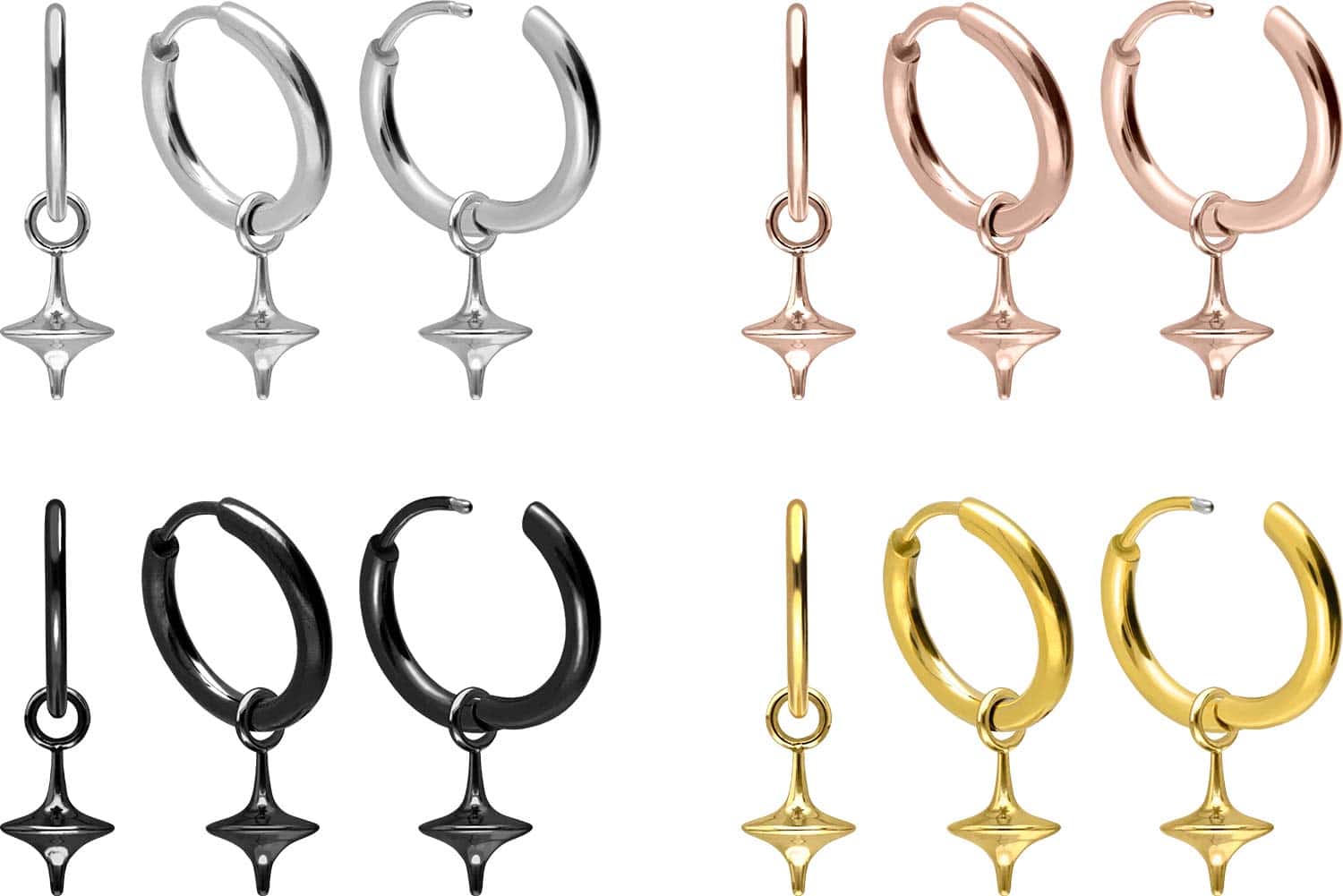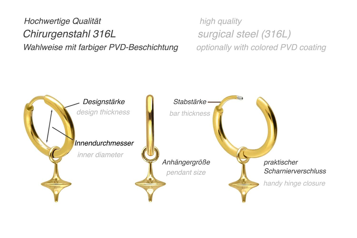 Farbe nach Wahl, die durch die Hochglanzpolitur zusätzlich veredelt wird. Als optisches Highlight ist jeweils ein Anhänger in Form eines Kreisels an jeder Creole angebracht. Sie verfügen stets über eine Stabstärke von 0,8 mm, wohingegen ihre Designstärke je nach persönlicher