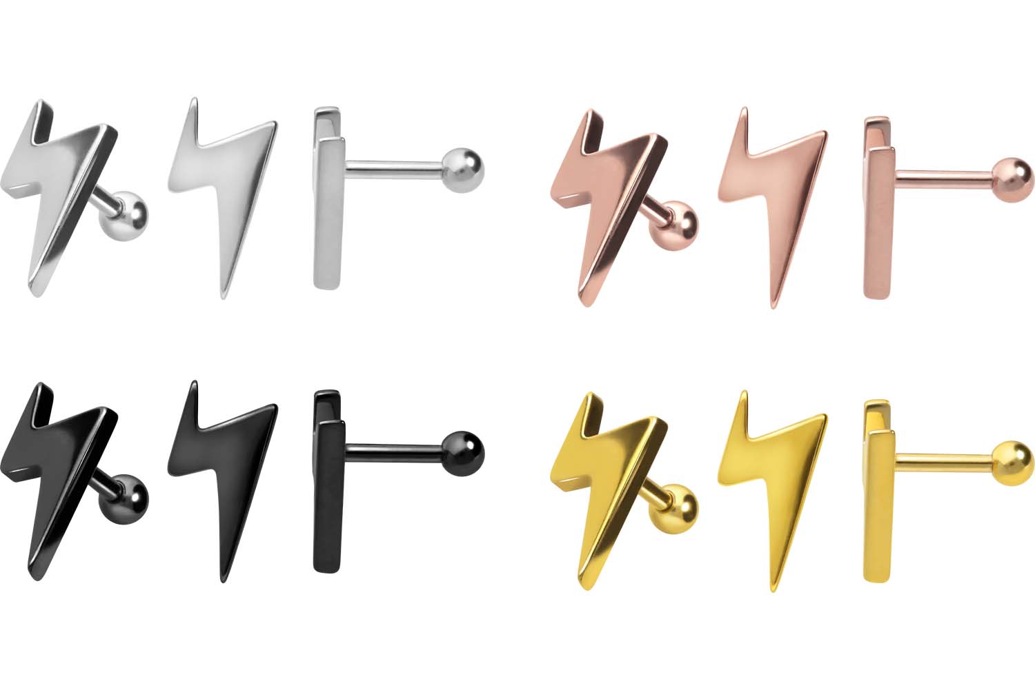 ebene Beschaffenheit und hohe Beständigkeit verfügt. Im Falle der schwarzen, gold- und roségoldfarbenen Variante ist er mit einer kratzfesten PVD-Beschichtung überzogen. Visuell überzeugt das Schmuckstück mit dem Design in Form eines Blitzes. Erhältlich ist das Ohrpiercing mit einer Stabstärke von 1,2 mm und einer Stablänge von 6