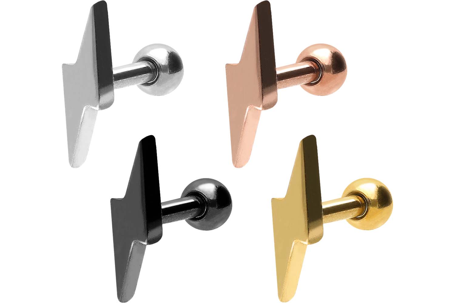 ebene Beschaffenheit und hohe Beständigkeit verfügt. Im Falle der schwarzen, gold- und roségoldfarbenen Variante ist er mit einer kratzfesten PVD-Beschichtung überzogen. Visuell überzeugt das Schmuckstück mit dem Design in Form eines dezenten Blitzes. Erhältlich ist das Ohrpiercing mit einer Stabstärke von 1,2 mm und einer Stablänge von 6