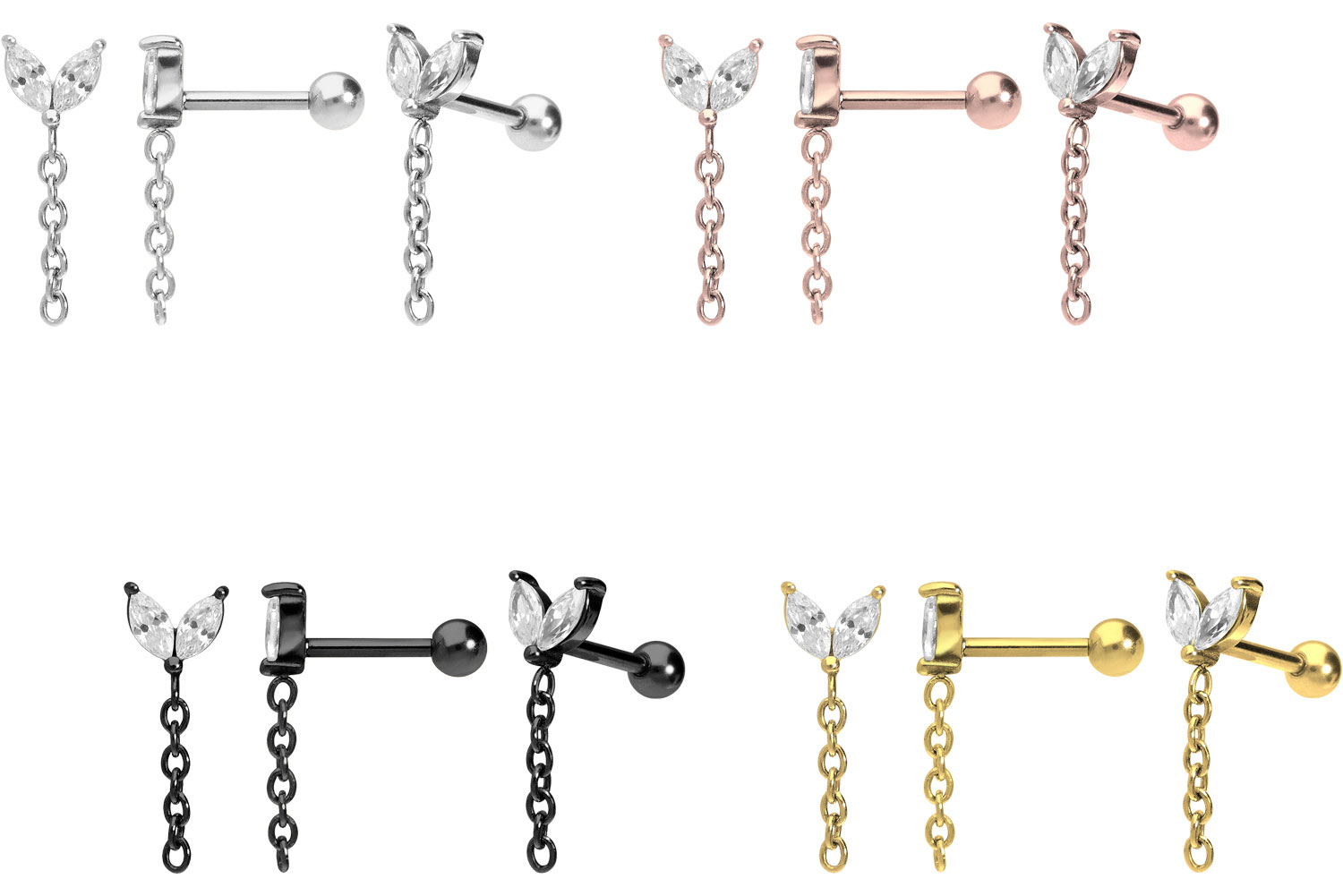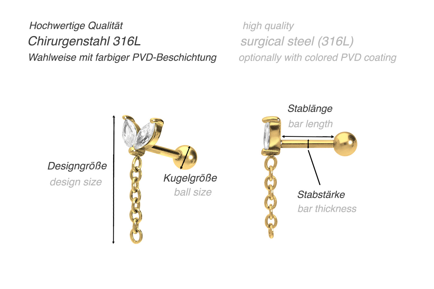Dieses atemberaubend schöne Ohrpiercing besteht aus hochwertigem Chirurgenstahl 316L, der bekanntermaßen über Materialeigenschaften wie ebene Beschaffenheit und hohe Beständigkeit verfügt. Im Falle der schwarzen, gold- und roségoldfarbenen Variante ist er mit einer kratzfesten PVD-Beschichtung überzogen. Visuell überzeugt das Schmuckstück mithilfe der funkelnden Knospe, die zusätzlich mit einer Kette verziert ist. Erhältlich ist das Ohrpiercing mit einer Stabstärke von 1,2 mm und einer Stablänge von 6 mm.