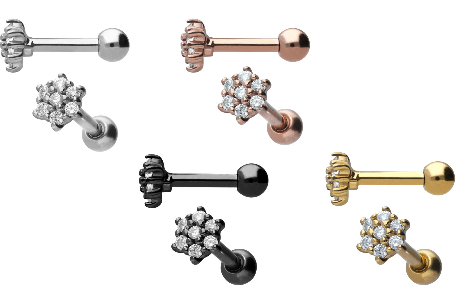 Dieses atemberaubend schöne Ohrpiercing besteht aus hochwertigem Chirurgenstahl 316L, der bekanntermaßen über Materialeigenschaften wie ebene Beschaffenheit und hohe Beständigkeit verfügt. Im Falle der schwarzen, gold- und roségoldfarbenen Variante ist er mit einer kratzfesten PVD-Beschichtung überzogen. Dank des ansprechenden Designs bestehend aus einer Blume, in deren Blütenblättern sich je ein klarer Kristall befindet, erhält das Schmuckstück einen einzigartigen Charme. Erhältlich ist es mit einer Stabstärke von 1,2 mm und einer Stablänge von 6 mm.