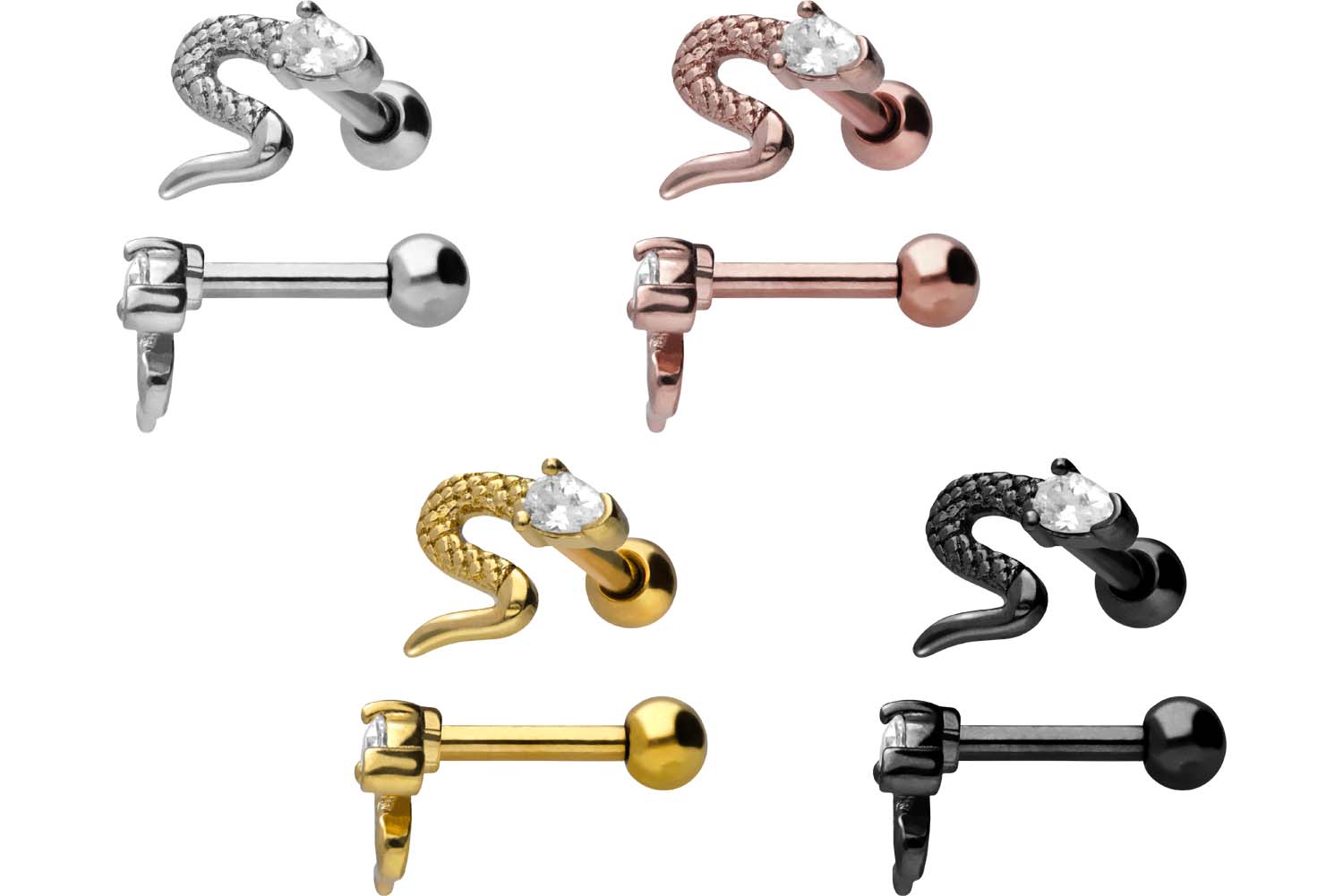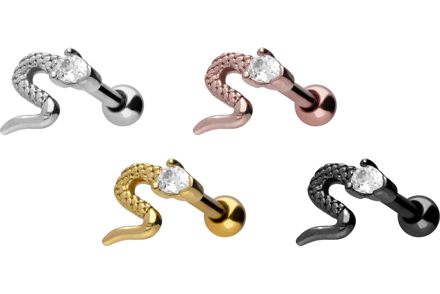 ebene Beschaffenheit und hohe Beständigkeit verfügt. Im Falle der schwarzen, gold- und roségoldfarbenen Variante ist er mit einer kratzfesten PVD-Beschichtung überzogen. Besonders einzigartig ist das Design in Form einer Schlange, die dem Schmuckstück einen schaurig-schönen Glanz verleiht. Zudem ist der Kopf der Schlange mit einem klaren Kristall versehen. Erhältlich ist das Ohrpiercing mit einer Stabstärke von 1,2 mm und einer Stablänge