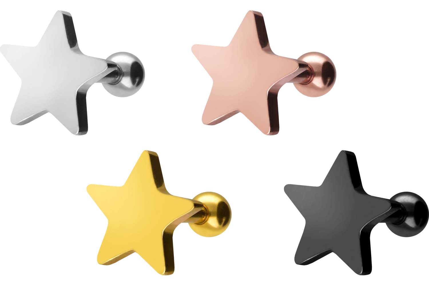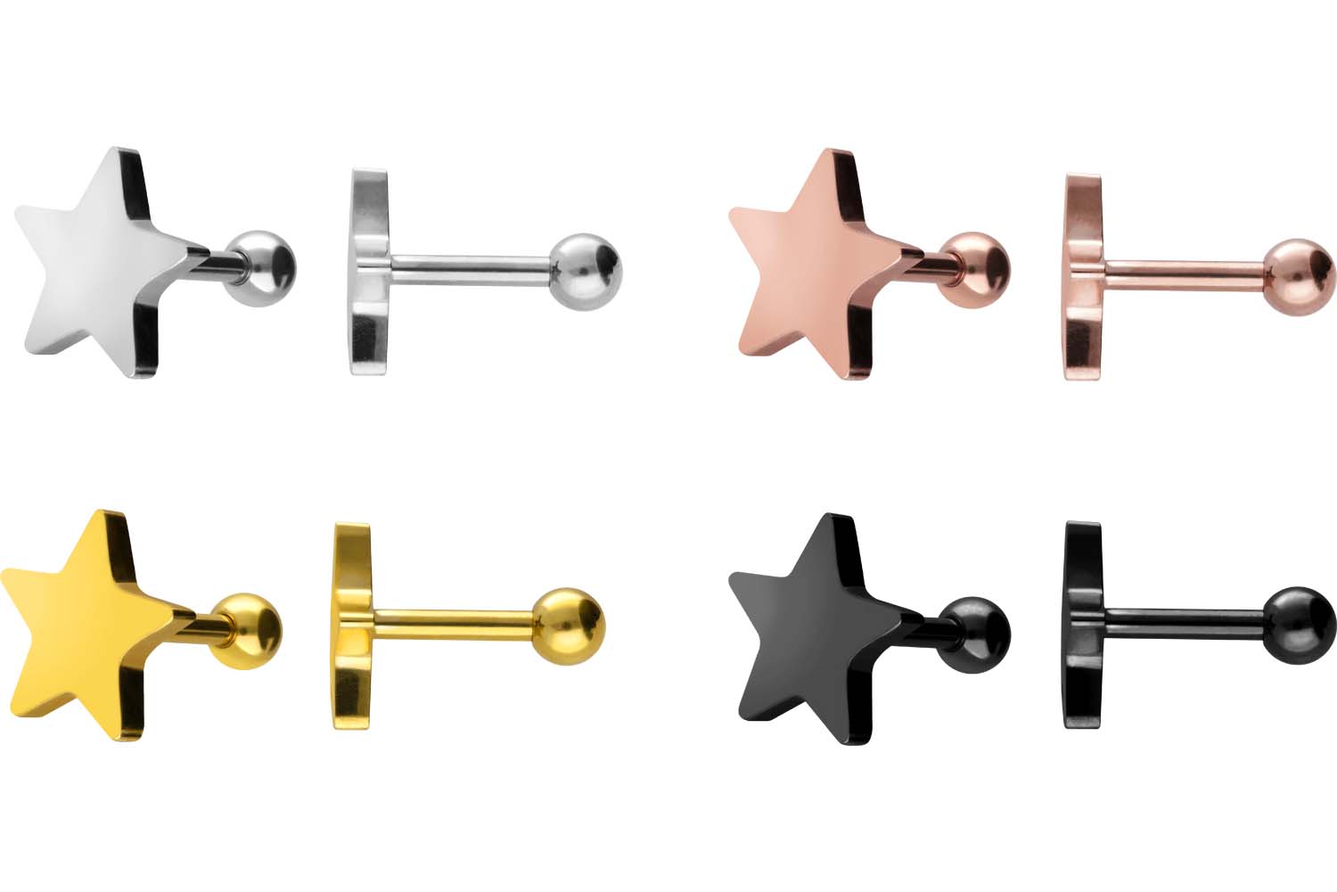 ebene Beschaffenheit und hohe Beständigkeit verfügt. Im Falle der schwarzen, gold- und roségoldfarbenen Variante ist er mit einer kratzfesten PVD-Beschichtung überzogen. Visuell überzeugt das Schmuckstück mit dem Design in Form eines Sterns. Erhältlich ist das Ohrpiercing mit einer Stabstärke von 1,2 mm und einer Stablänge von 6
