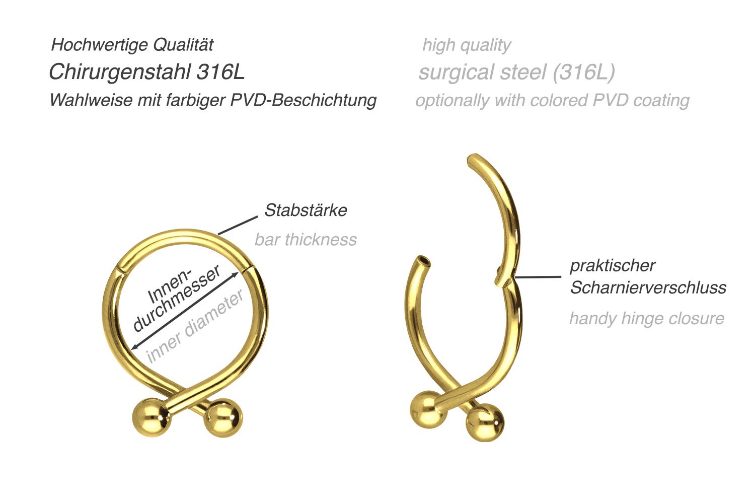 das Piercing mit einer kratzfesten PVD-Beschichtung überzogen. Visuell überzeugt das Schmuckstück mithilfe des stilvollen Designs, das aus zwei sich überkreuzenden Kugeln besteht. Ob am Ohr, der Nase, oder der Lippe - unsere Clicker sind für die verschiedensten Piercingstellen geeignet. Dieser Clicker hat eine Stabstärke von 1,2 mm und ist in den unten aufgeführten Innendurchmessern erhältlich.