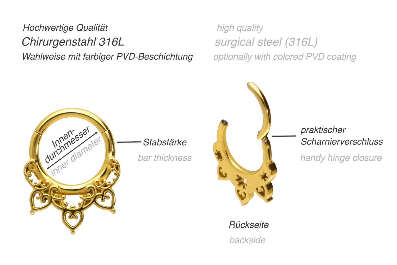 das Piercing mit einer kratzfesten PVD-Beschichtung überzogen. Als besonderes Highlight zieren den stilvollen Clicker drei verspielte Herzen. Ob am Ohr, der Nase, oder der Lippe – unsere Clicker sind für die verschiedensten Piercingstellen geeignet. Dieses Piercing hat eine Stabstärke von 1,2 mm und ist mit einem Innendurchmessern von 8 mm erhältlich.