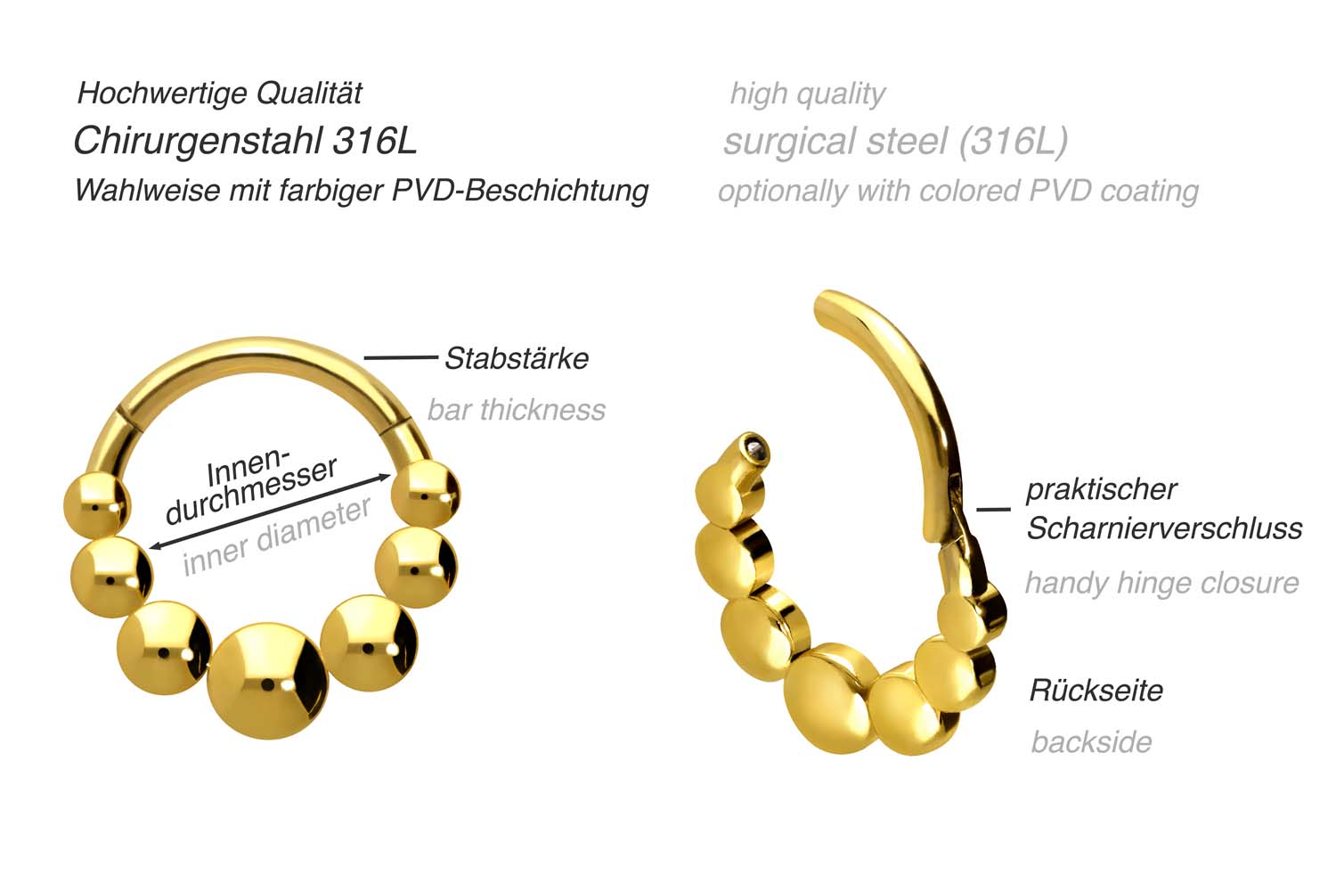 das Piercing mit einer kratzfesten PVD-Beschichtung überzogen. Besonders ansprechend wirkt das Schmuckstück aufgrund des eleganten Designs bestehend aus einigen abgeflachten Kugeln. Ob am Ohr, der Nase, oder der Lippe – unsere Clicker sind für die verschiedensten Piercingstellen geeignet. Dieser Clicker hat eine Stabstärke von 1,2 mm und ist mit einem Innendurchmesser von 8 mm erhältlich.