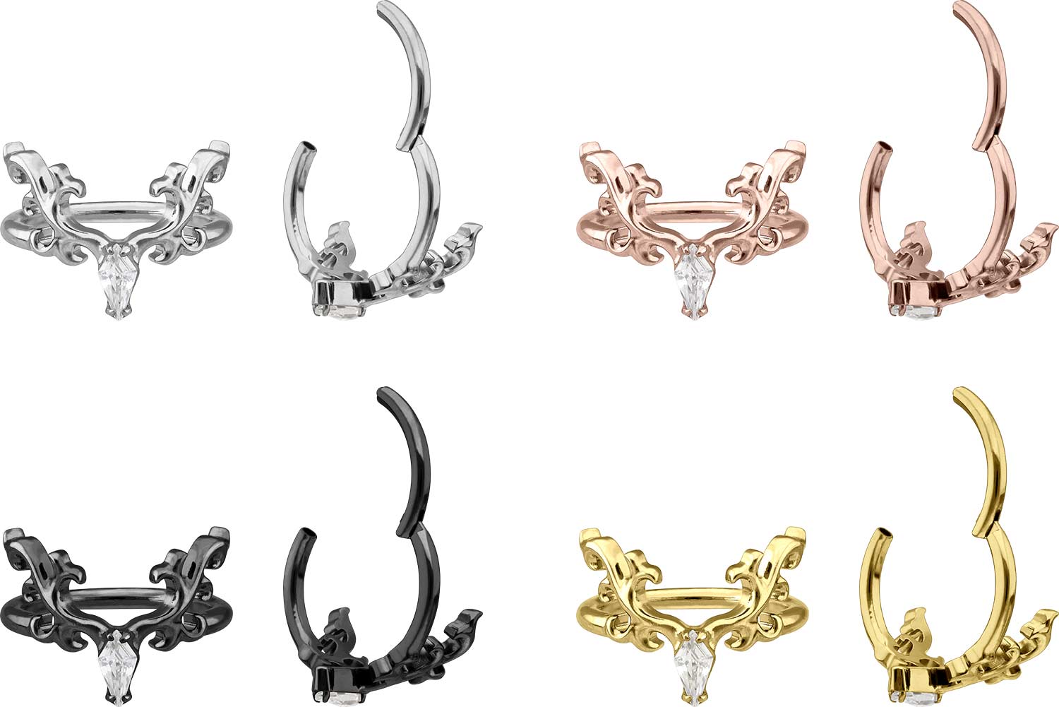 Einfache Handhabung und schönes Design - das sind unsere Clicker! Als Hauptmerkmal der Clicker zählt das praktische Scharnier, das den Einsatz in den Stichkanal enorm erleichtert. Das zur Herstellung verwendete Material (Chirurgenstahl 316L) zeichnet sich insbesondere durch ebene Beschaffenheit und hochwertige Qualität aus. Je nach Farbwunsch ist das Piercing mit einer kratzfesten PVD-Beschichtung überzogen. Ein besonderes Highlight ist das schöne Design mit dem funkelnden Hirschkopf. Ob am Ohr, der Nase, oder der Lippe - unsere Clicker sind für die verschiedensten Piercingstellen geeignet. Dieser Clicker hat eine Stabstärke von 1,2 mm und ist in den unten aufgeführten Innendurchmessern erhältlich.