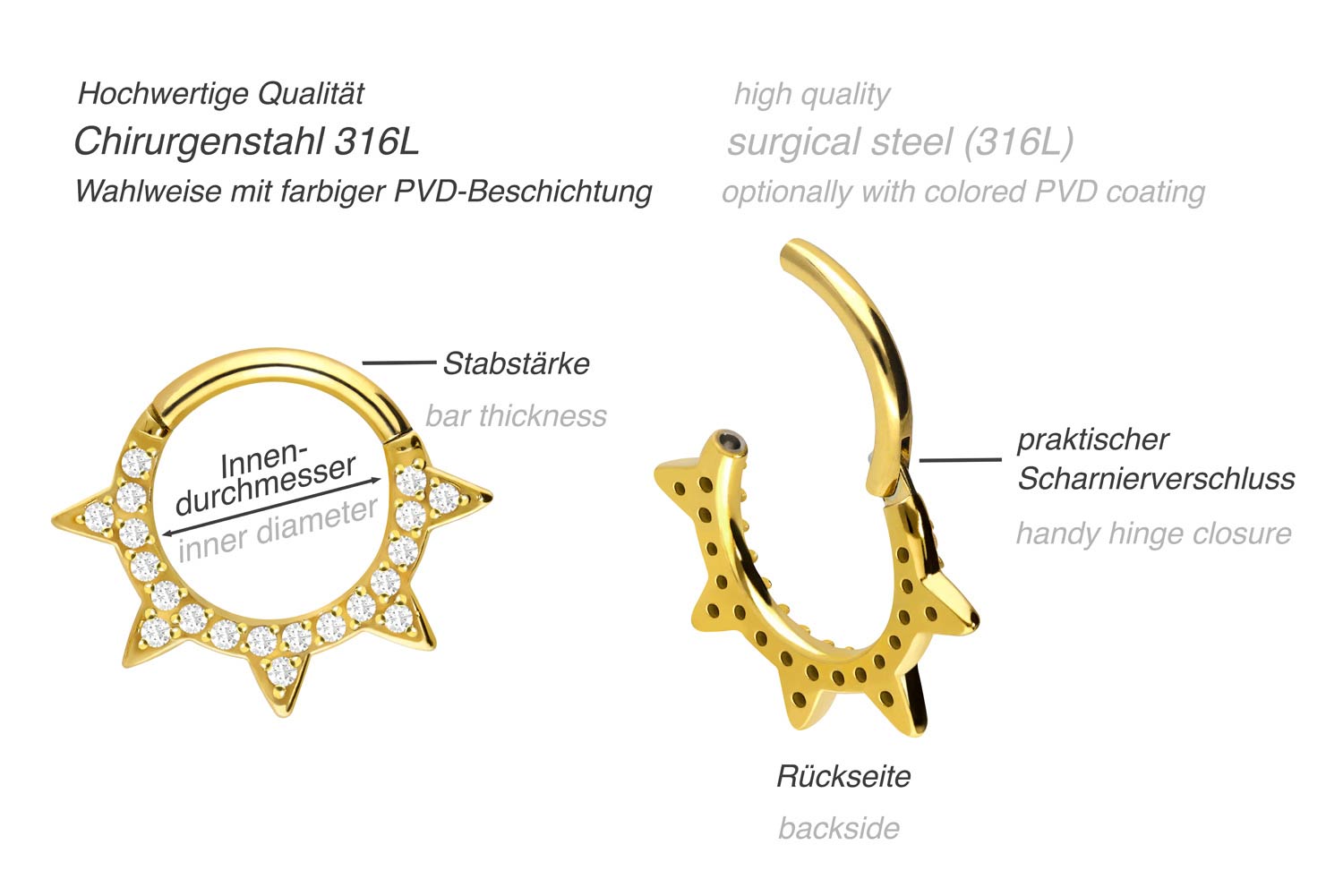 das Piercing mit einer kratzfesten PVD-Beschichtung überzogen. Seinen einzigartigen Charme hat das Schmuckstück den zahlreichen Kristallen zu verdanken, die sich über die formschönen Spitzen verteilen. Ob am Ohr, der Nase, oder der Lippe - unsere Clicker sind für die verschiedensten Piercingstellen geeignet. Dieser Clicker hat eine
