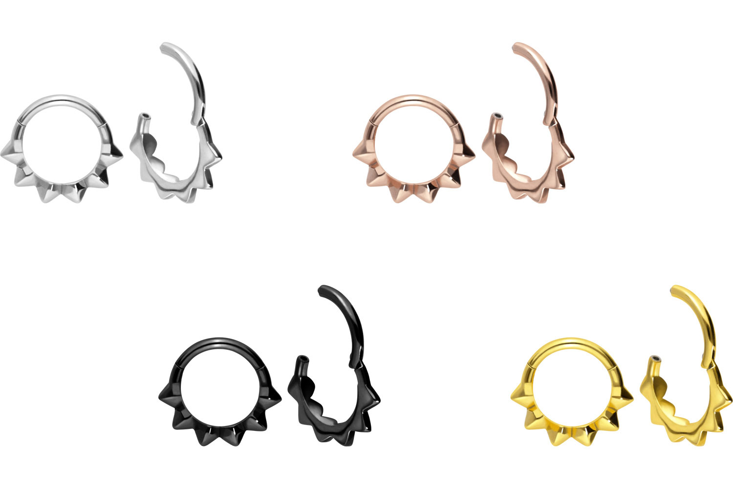 das Piercing mit einer kratzfesten PVD-Beschichtung überzogen. Visuell überzeugt das Schmuckstück mithilfe der stilvollen Spitzen. Ob am Ohr, der Nase, oder der Lippe - unsere Clicker sind für die verschiedensten Piercingstellen geeignet. Dieser Clicker hat eine Stabstärke von 1,2 mm und ist mit einem Innendurchmesser von 8 mm erhältlich.