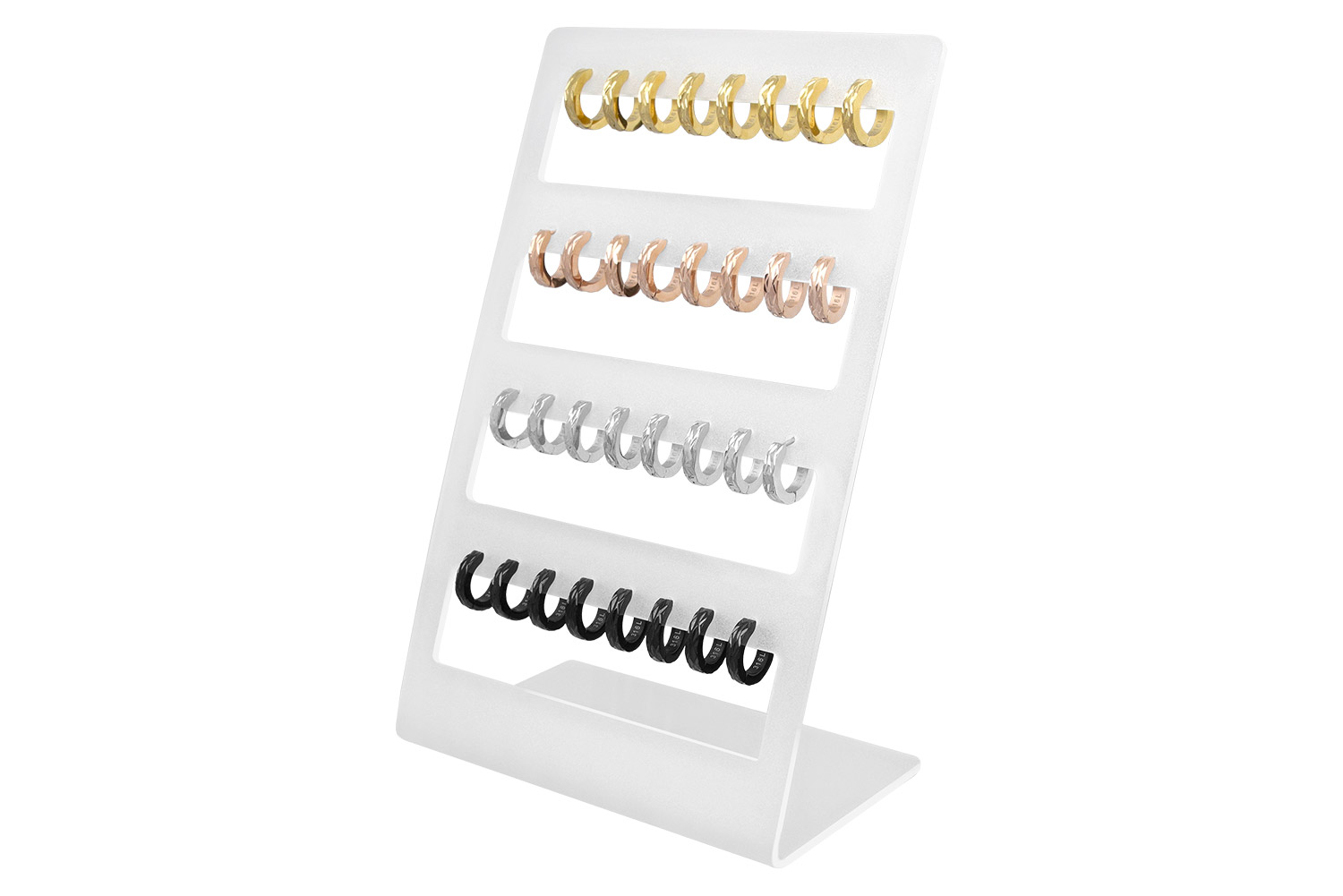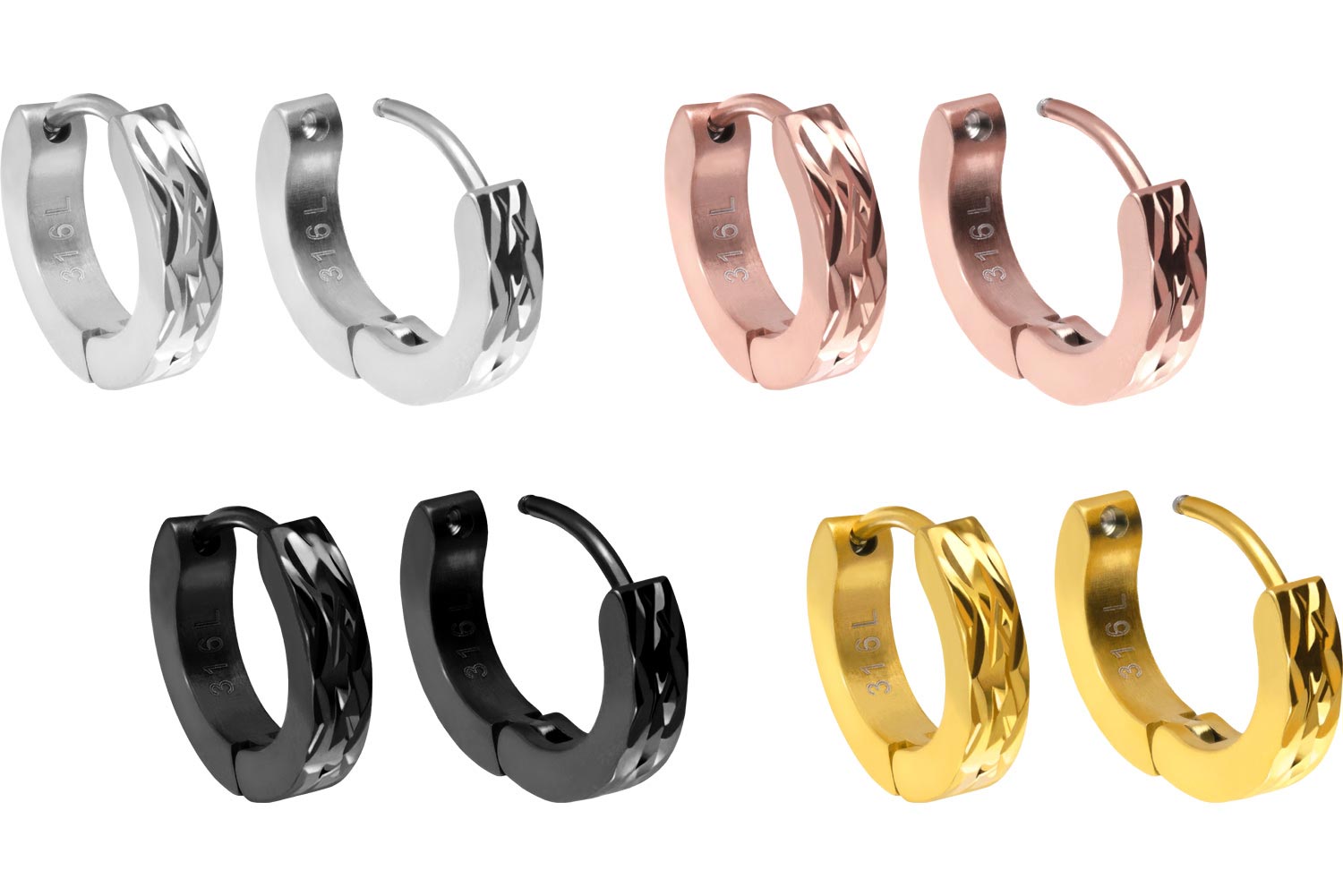 Diese stilvollen Creolen sind aus Chirurgenstahl 316L gefertigt, der neben seiner hohen Qualität auch für Materialeigenschaften wie hohe Beständigkeit und ebene Beschaffenheit bekannt ist. Dank der geschickten Kombination aus einem verspieltem Design mit der hochglanzpolierten Oberfläche, die außerdem für ein edles Finish sorgt, wirken die Creolen besonders ansprechend und erweisen sich so als ideale Alltagsbegleiter. Farblich sind sie in silber-, roségold-, goldfarben und schwarz erhältlich, wobei die letzten drei Varianten mit einer kratzfesten PVD-Beschichtung versehen sind. Darüber hinaus werden die Creolen, wie abgebildet, in einem Display mit insgesamt 16 Paaren geliefert.