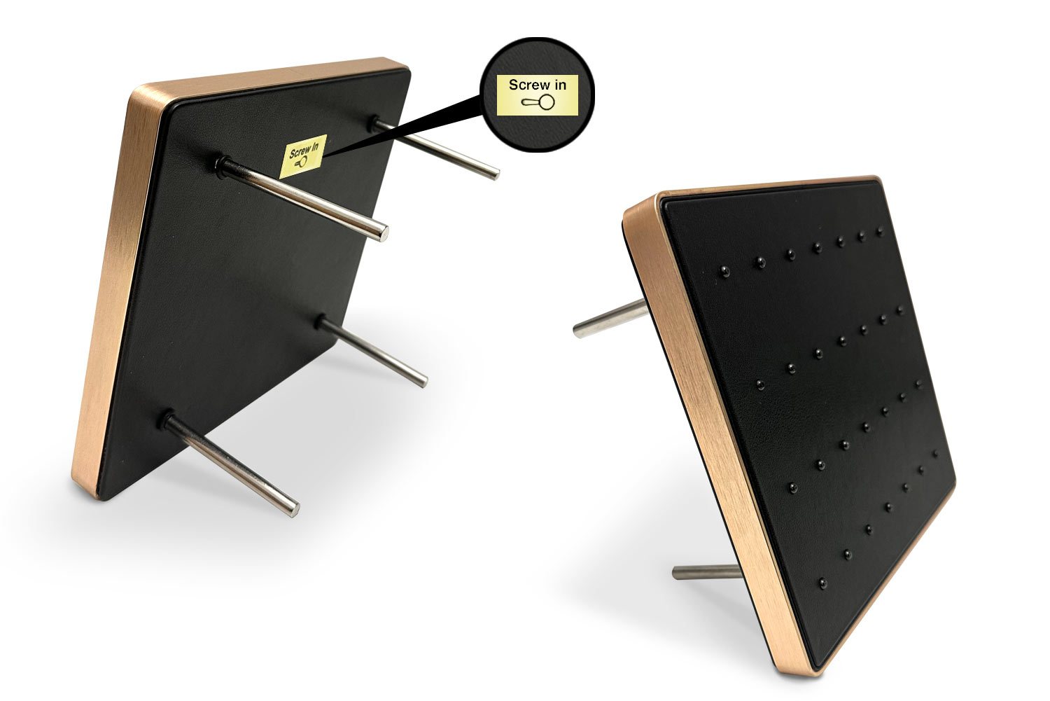 Dieses hochwertige Lederimitat Display ist perfekt dafür geeignet, um Schraubaufsätze aus Gold mit einem 0,8 mm starken Außengewinde professionell zu präsentieren. Diese können problemlos in die insgesamt 28 dafür vorgesehenen Steckplätze eingeschraubt und wieder entfernt werden. Der aus Edelstahl gefertigte Rand verleiht dem Display ein edles Finish. Durch die individuell abschraubbaren Standfüße des Displays wird ein sicherer Halt gewährleistet und die Produkte lassen sich auf viele verschiedene Arten ansprechend auf dem Tresen oder auch in einer Vitrine präsentieren.