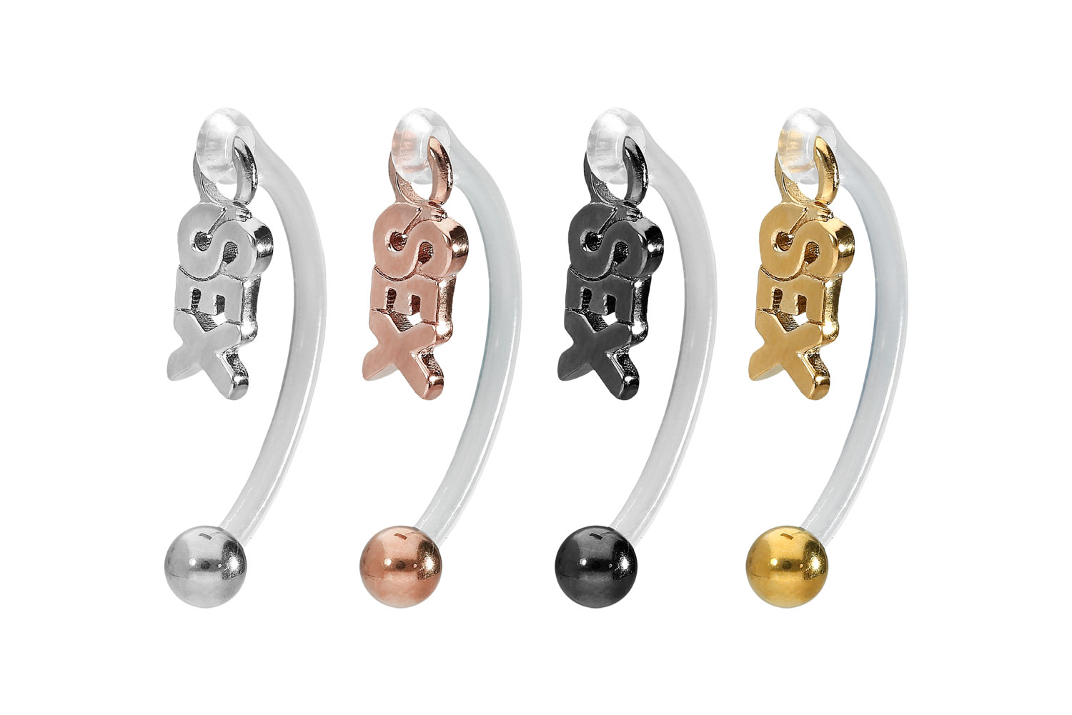 Der Stab dieses wunderschönen Bananabells besteht aus polymer medizinisch flexiblem Kunststoff, besser bekannt unter der Abkürzung PMFK. Im Gegensatz dazu wurden die Schraubkugel und der Anhänger aus Chirurgenstahl 316L gefertigt. Beide Materialien überzeugen mit nützlichen Eigenschaften wie beispielsweise ausgeprägter Gewebeverträglichkeit sowie Beständigkeit, genauso wie hochwertiger Qualität. PMFK ergänzt all dies um einen weiteren Vorteil: die Flexibilität. Zudem ist die Länge des daraus bestehenden transparenten Stabes variabel, da sie nach Belieben mit einer gewöhnlichen Haushaltsschere den eigenen Vorstellungen entsprechend angepasst werden kann. Der Anhänger in Form eines pikanten Schriftzuges und die Schraubkugel stehen in vier verschiedenen Farben zur Auswahl, von denen drei mit einer