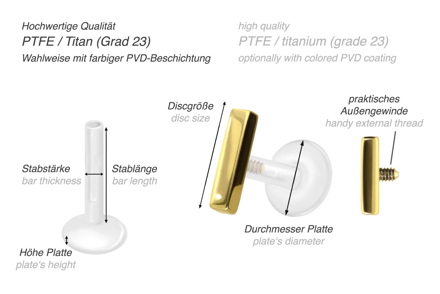 Dieses einzigartige Labret ist aus hochwertigem PTFE gefertigt, das ebenfalls unter dem Handelsnamen Teflon bekannt ist. Nur der Schraubaufsatz mit Außengewinde in Form eines Balkens wurde anstelle dessen aus Titan gefertigt. Beide Materialien verfügen neben ihrer exzellenten Qualität auch über weitere nützliche Eigenschaften wie etwa besonders gute Hautveträglichkeit und Beständigkeit. PTFE betreffend kommen Flexibilität und Anpassungsfähigkeit hinzu. Letztere macht sich im Falle dieses Artikels dadurch bemerkbar, dass sich der Stab je nach Belieben mit einer gewöhnlichen Haushaltsschere kürzen lässt. Anschließend kann mithilfe des Aufsatzes ein neues Gewinde eingedreht werden, sodass weiterhin ein optimaler Halt gewährleistet wird. Zu den Vorzügen von Titan gehört Farbechtheit, die auch bei den farbigen Varianten