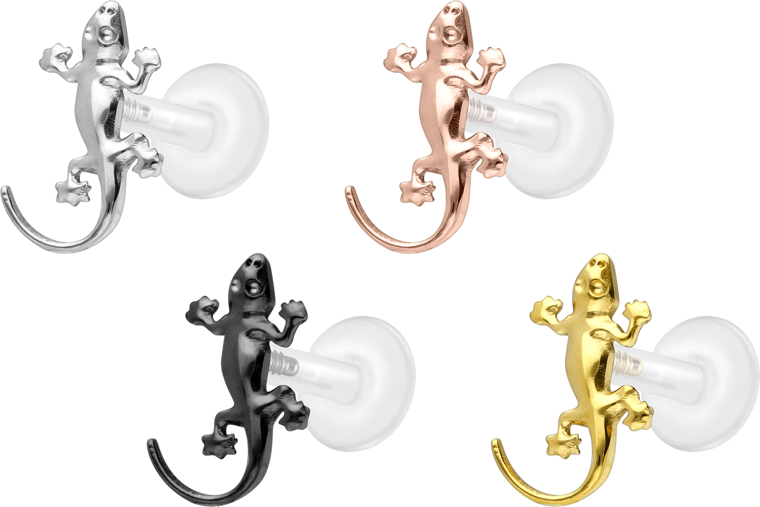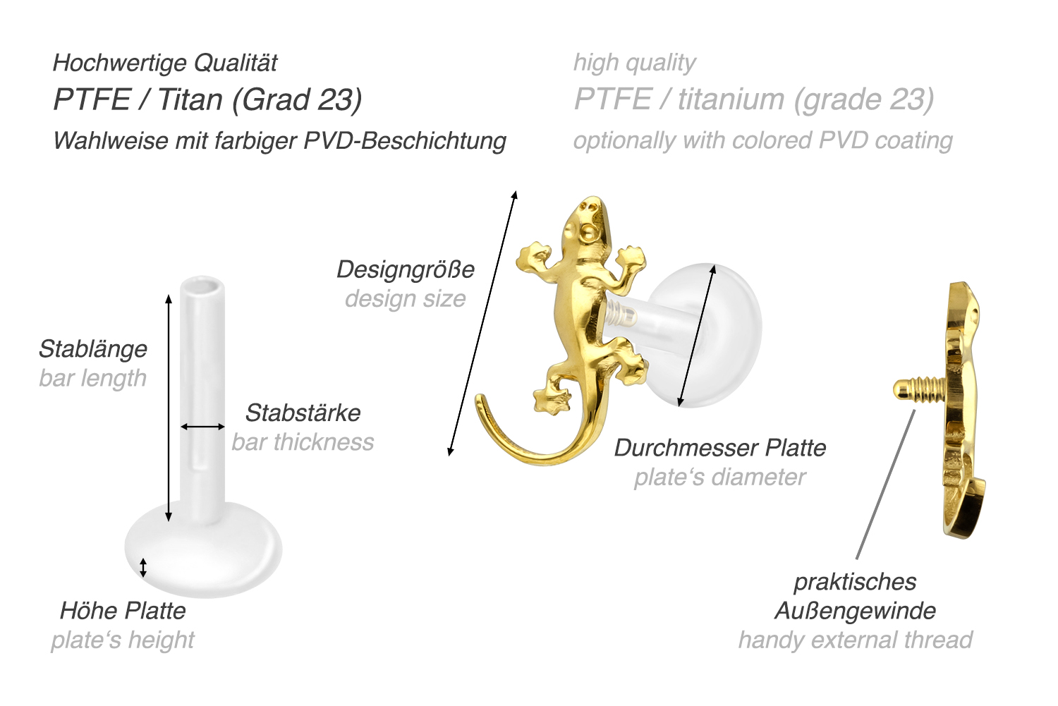 Dieses einzigartige Labret ist aus hochwertigem PTFE gefertigt, das ebenfalls unter dem Handelsnamen Teflon bekannt ist. Nur der Schraubaufsatz mit Außengewinde in Form eines Geckos wurde anstelle dessen aus Titan gefertigt. Beide Materialien verfügen neben ihrer exzellenten Qualität auch über weitere nützliche Eigenschaften wie etwa besonders gute Hautveträglichkeit und Beständigkeit. PTFE betreffend kommen Flexibilität und Anpassungsfähigkeit hinzu. Letztere macht sich im Falle dieses Artikels dadurch bemerkbar, dass sich der Stab je nach Belieben mit einer gewöhnlichen Haushaltsschere kürzen lässt. Anschließend kann mithilfe des Aufsatzes ein neues Gewinde eingedreht werden, sodass weiterhin ein optimaler Halt gewährleistet wird. Zu den Vorzügen von Titan gehört Farbechtheit, die auch bei den farbigen Varianten