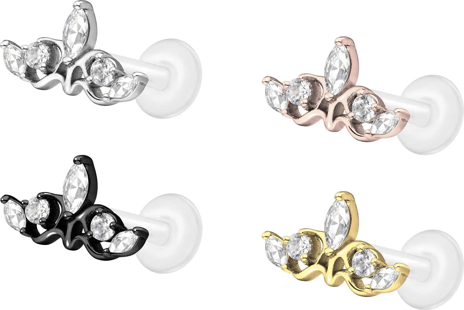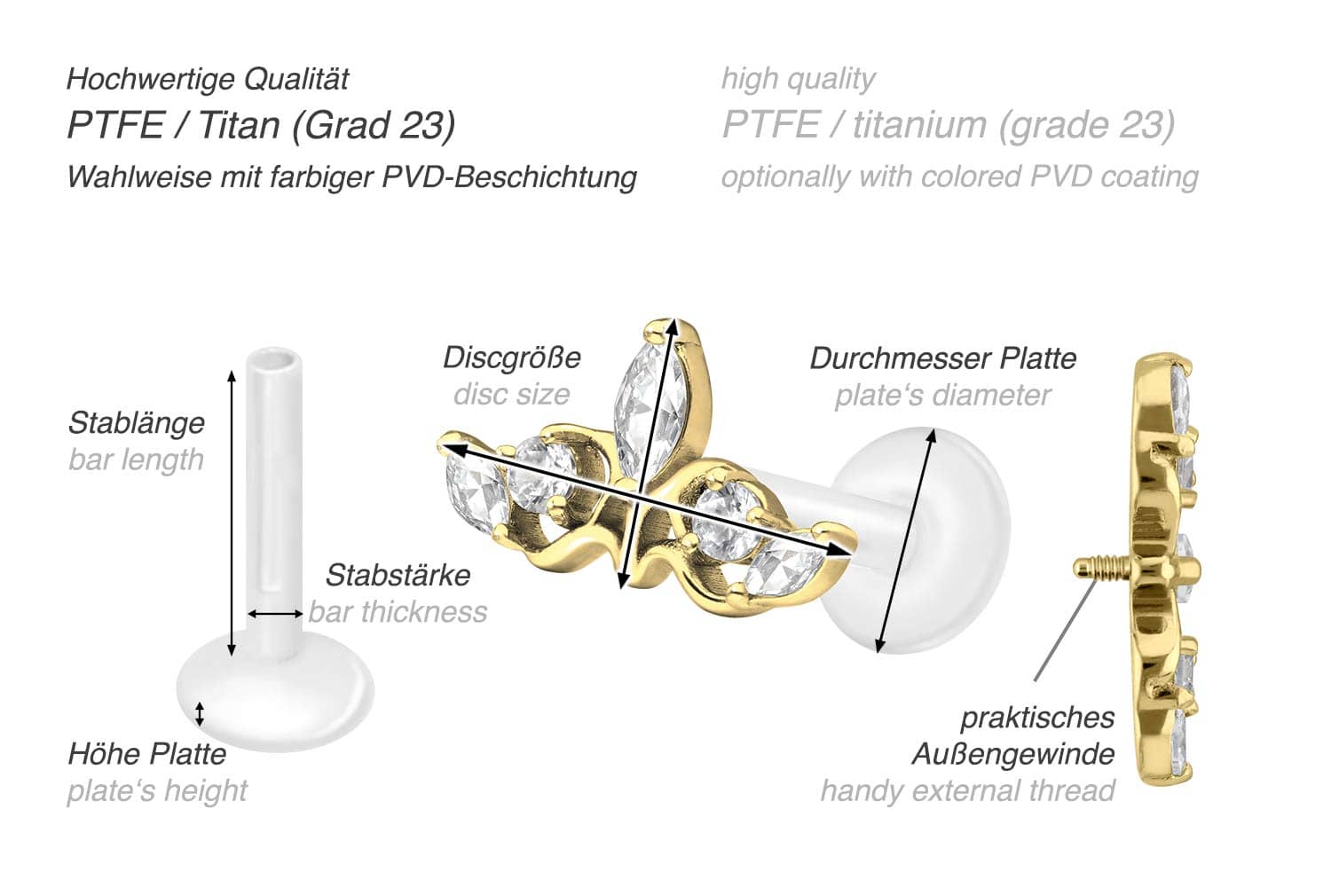 Dieses einzigartige Labret ist aus hochwertigem PTFE gefertigt, das ebenfalls unter dem Handelsnamen Teflon bekannt ist. Nur der Schraubaufsatz mit Außengewinde in Form einer gotischen Krone wurde anstelle dessen aus Titan gefertigt. Beide Materialien verfügen neben ihrer exzellenten Qualität auch über weitere nützliche Eigenschaften wie etwa besonders gute Hautveträglichkeit und Beständigkeit. PTFE betreffend kommen Flexibilität und Anpassungsfähigkeit hinzu. Letztere macht sich im Falle dieses Artikels dadurch bemerkbar, dass sich der Stab je nach Belieben mit einer gewöhnlichen Haushaltsschere kürzen lässt. Anschließend kann mithilfe des Aufsatzes ein neues Gewinde eingedreht werden, sodass weiterhin ein optimaler Halt gewährleistet wird. Zu den Vorzügen von Titan gehört Farbechtheit, die auch bei den farbigen Varianten mit PVD-Beschichtung gewährleistet wird. Das Labret hat eine Stabstärke von entweder 1,2 oder 1,6 mm und ist in den unten aufgeführten Stablängen erhältlich. Darüber hinaus kann sein 0,9 mm Innengewinde nach Belieben mit all unseren anderen Schraubaufsätzen mit entsprechendem Außengewinde kombiniert werden.