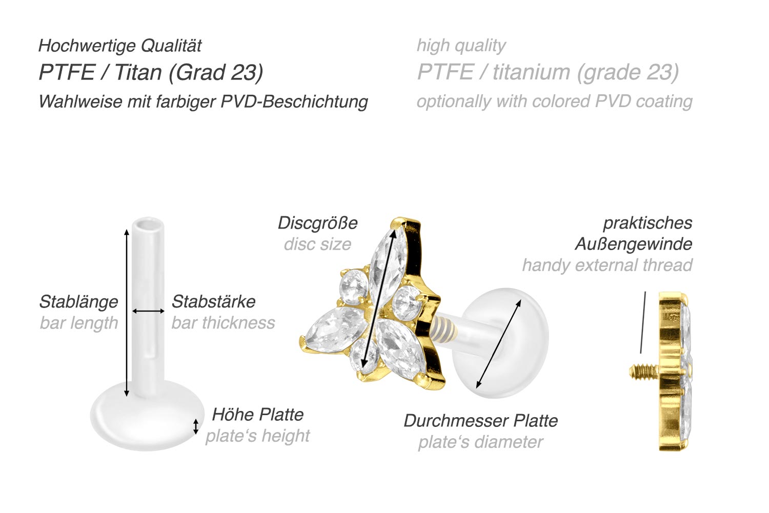 Dieses einzigartige Labret ist aus hochwertigem PTFE gefertigt, das ebenfalls unter dem Handelsnamen Teflon bekannt ist. Nur der Schraubaufsatz mit Außengewinde in Form einer Blüte wurde anstelle dessen aus Titan gefertigt. Beide Materialien verfügen neben ihrer exzellenten Qualität auch über weitere nützliche Eigenschaften wie etwa besonders gute Hautveträglichkeit und Beständigkeit. PTFE betreffend kommen Flexibilität und Anpassungsfähigkeit hinzu. Letztere macht sich im Falle dieses Artikels dadurch bemerkbar, dass sich der Stab je nach Belieben mit einer gewöhnlichen Haushaltsschere kürzen lässt. Anschließend kann mithilfe des Aufsatzes ein neues Gewinde eingedreht werden, sodass weiterhin ein optimaler Halt gewährleistet wird. Zu den Vorzügen von Titan gehört Farbechtheit, die auch bei den farbigen Varianten mit PVD-Beschichtung gewährleistet wird. Das Labret hat eine Stabstärke von entweder 1,2 oder 1,6 mm und ist in den unten aufgeführten Stablängen erhältlich. Darüber hinaus kann sein 0,9 mm Innengewinde nach Belieben mit all unseren anderen Schraubaufsätzen mit entsprechendem Außengewinde kombiniert werden.