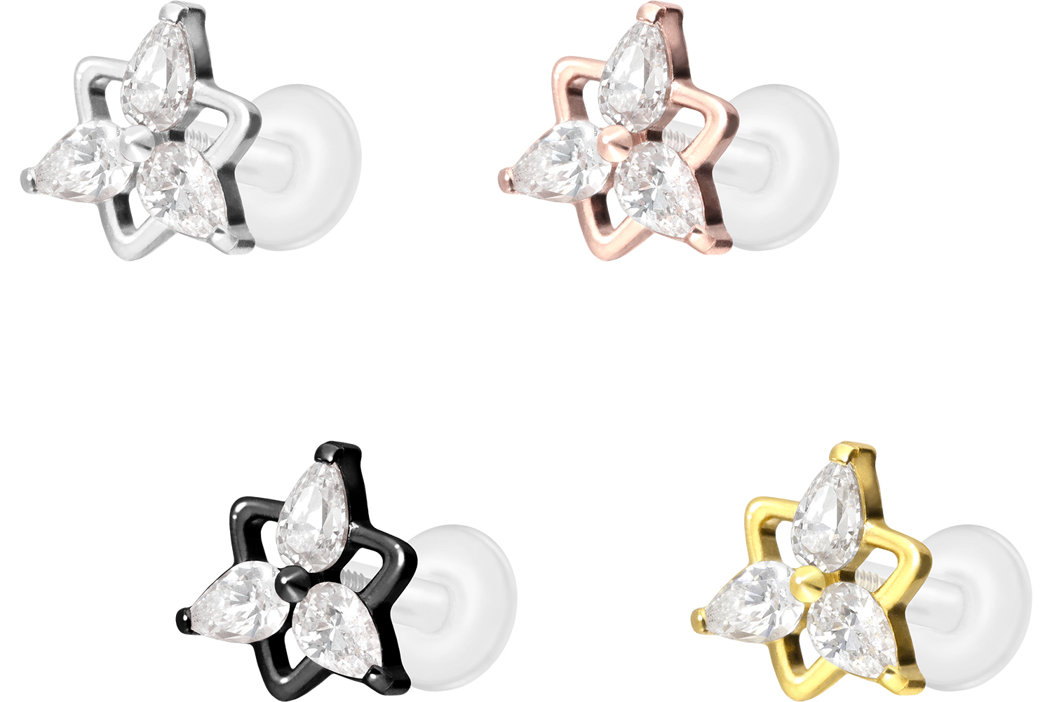 Dieses einzigartige Labret ist aus hochwertigem PTFE gefertigt, das ebenfalls unter dem Handelsnamen Teflon bekannt ist. Nur der Schraubaufsatz mit Außengewinde in Form einer Kristallblume wurde anstelle dessen aus Titan gefertigt. Beide Materialien verfügen neben ihrer exzellenten Qualität auch über weitere nützliche Eigenschaften wie etwa besonders gute Hautveträglichkeit und Beständigkeit. PTFE betreffend kommen Flexibilität und Anpassungsfähigkeit hinzu. Letztere macht sich im Falle dieses Artikels dadurch bemerkbar, dass sich der Stab je nach Belieben mit einer gewöhnlichen Haushaltsschere kürzen lässt. Anschließend kann mithilfe des Aufsatzes ein neues Gewinde eingedreht werden, sodass weiterhin ein optimaler Halt gewährleistet wird. Zu den Vorzügen von Titan gehört Farbechtheit, die auch bei den farbigen Varianten mit PVD-Beschichtung gewährleistet wird. Das Labret hat eine Stabstärke von entweder 1,2 oder 1,6 mm und ist in den unten aufgeführten Stablängen erhältlich. Darüber hinaus kann sein 0,9 mm Innengewinde nach Belieben mit all unseren anderen Schraubaufsätzen mit entsprechendem Außengewinde kombiniert werden.