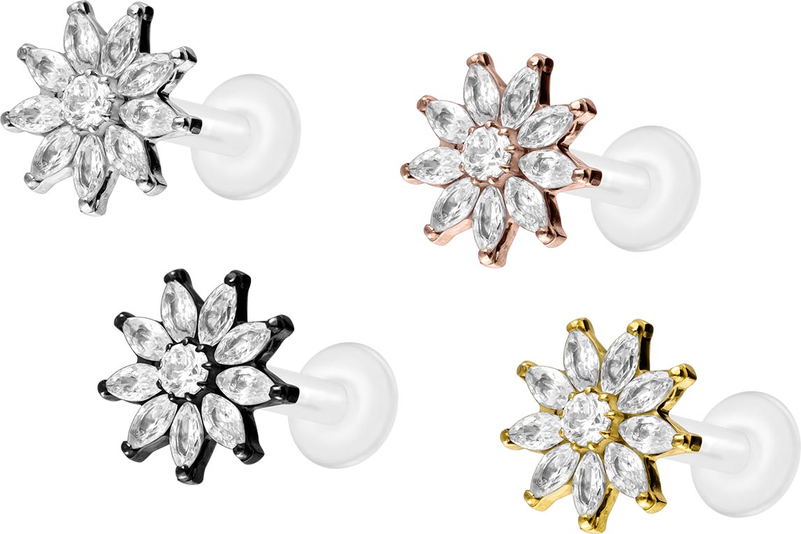 Dieses einzigartige Labret ist aus hochwertigem PTFE gefertigt, das ebenfalls unter dem Handelsnamen Teflon bekannt ist. Nur der Schraubaufsatz mit Außengewinde in Form einer Blume wurde anstelle dessen aus Titan gefertigt. Beide Materialien verfügen neben ihrer exzellenten Qualität auch über weitere nützliche Eigenschaften wie etwa besonders gute Hautveträglichkeit und Beständigkeit. PTFE betreffend kommen Flexibilität und Anpassungsfähigkeit hinzu. Letztere macht sich im Falle dieses Artikels dadurch bemerkbar, dass sich der Stab je nach Belieben mit einer gewöhnlichen Haushaltsschere kürzen lässt. Anschließend kann mithilfe des Aufsatzes ein neues Gewinde eingedreht werden, sodass weiterhin ein optimaler Halt gewährleistet wird. Zu den Vorzügen von Titan gehört Farbechtheit, die auch bei den farbigen Varianten mit PVD-Beschichtung gewährleistet wird. Das Labret hat eine Stabstärke von entweder 1,2 oder 1,6 mm und ist in den unten aufgeführten Stablängen erhältlich. Darüber hinaus kann sein 0,9 mm Innengewinde nach Belieben mit all unseren anderen Schraubaufsätzen mit entsprechendem Außengewinde kombiniert werden.