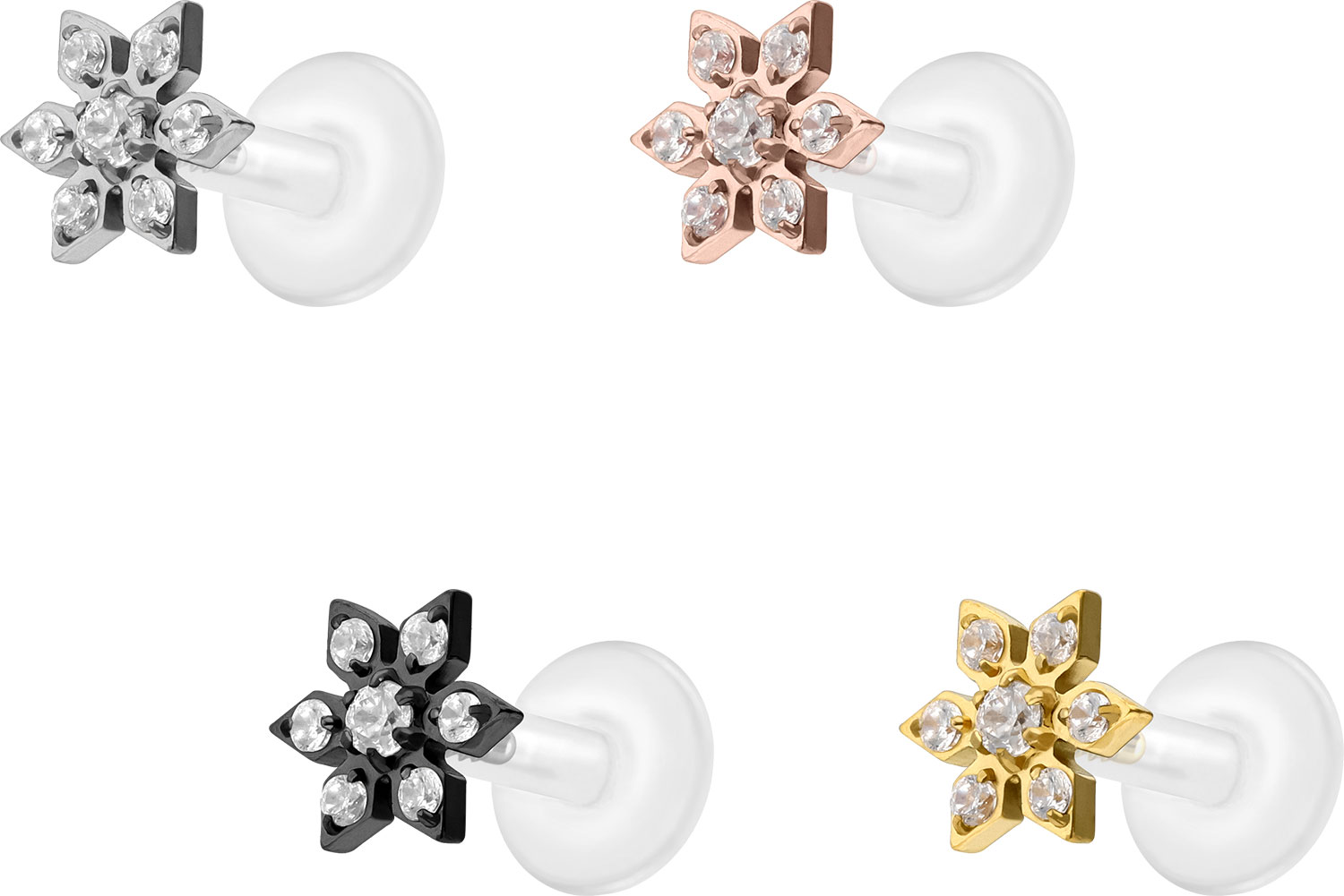 Dieses einzigartige Labret ist aus hochwertigem PTFE gefertigt, das ebenfalls unter dem Handelsnamen Teflon bekannt ist. Nur der Schraubaufsatz mit Außengewinde in Form einer Kristallblume wurde anstelle dessen aus Titan gefertigt. Beide Materialien verfügen neben ihrer exzellenten Qualität auch über weitere nützliche Eigenschaften wie etwa besonders gute Hautveträglichkeit und Beständigkeit. PTFE betreffend kommen Flexibilität und Anpassungsfähigkeit hinzu. Letztere macht sich im Falle dieses Artikels dadurch bemerkbar, dass sich der Stab je nach Belieben mit einer gewöhnlichen Haushaltsschere kürzen lässt. Anschließend kann mithilfe des Aufsatzes ein neues Gewinde eingedreht werden, sodass weiterhin ein optimaler Halt gewährleistet wird. Zu den Vorzügen von Titan gehört Farbechtheit, die auch bei den farbigen Varianten mit PVD-Beschichtung gewährleistet wird. Das Labret hat eine Stabstärke von entweder 1,2 oder 1,6 mm und ist in den unten aufgeführten Stablängen erhältlich. Darüber hinaus kann sein 0,9 mm Innengewinde nach Belieben mit all unseren anderen Schraubaufsätzen mit entsprechendem Außengewinde kombiniert werden.