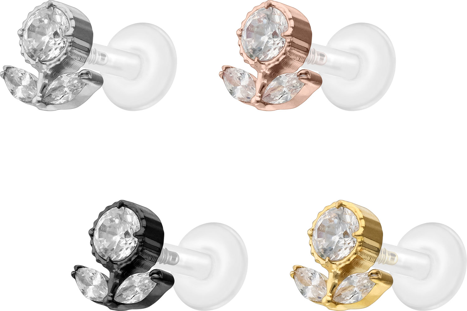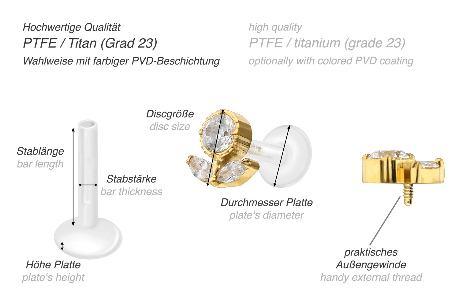 Dieses einzigartige Labret ist aus hochwertigem PTFE gefertigt, das ebenfalls unter dem Handelsnamen Teflon bekannt ist. Nur der Schraubaufsatz mit Außengewinde in Form einer Kristallblume wurde anstelle dessen aus Titan gefertigt. Beide Materialien verfügen neben ihrer exzellenten Qualität auch über weitere nützliche Eigenschaften wie etwa besonders gute Hautveträglichkeit und Beständigkeit. PTFE betreffend kommen Flexibilität und Anpassungsfähigkeit hinzu. Letztere macht sich im Falle dieses Artikels dadurch bemerkbar, dass sich der Stab je nach Belieben mit einer gewöhnlichen Haushaltsschere kürzen lässt. Anschließend kann mithilfe des Aufsatzes ein neues Gewinde eingedreht werden, sodass weiterhin ein optimaler Halt gewährleistet wird. Zu den Vorzügen von Titan gehört Farbechtheit, die auch bei den farbigen Varianten mit PVD-Beschichtung gewährleistet wird. Das Labret hat eine Stabstärke von entweder 1,2 oder 1,6 mm und ist in den unten aufgeführten Stablängen erhältlich. Darüber hinaus kann sein 0,9 mm Innengewinde nach Belieben mit all unseren anderen Schraubaufsätzen mit entsprechendem Außengewinde kombiniert werden.
