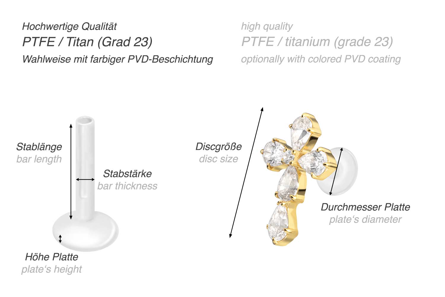 Dieses einzigartige Labret ist aus hochwertigem PTFE gefertigt, das ebenfalls unter dem Handelsnamen Teflon bekannt ist. Nur der Schraubaufsatz mit Außengewinde in Form eines Kristallkreuzes wurde anstelle dessen aus Titan gefertigt. Beide Materialien verfügen neben ihrer exzellenten Qualität auch über weitere nützliche Eigenschaften wie etwa besonders gute Hautveträglichkeit und Beständigkeit. PTFE betreffend kommen Flexibilität und Anpassungsfähigkeit hinzu. Letztere macht sich im Falle dieses Artikels dadurch bemerkbar, dass sich der Stab je nach Belieben mit einer gewöhnlichen Haushaltsschere kürzen lässt. Anschließend kann mithilfe des Aufsatzes ein neues Gewinde eingedreht werden, sodass weiterhin ein optimaler Halt gewährleistet wird. Zu den Vorzügen von Titan gehört Farbechtheit, die auch bei den farbigen Varianten mit PVD-Beschichtung gewährleistet wird. Das Labret hat eine Stabstärke von entweder 1,2 oder 1,6 mm und ist in den unten aufgeführten Stablängen erhältlich. Darüber hinaus kann sein 0,9 mm Innengewinde nach Belieben mit all unseren anderen Schraubaufsätzen mit entsprechendem Außengewinde kombiniert werden.