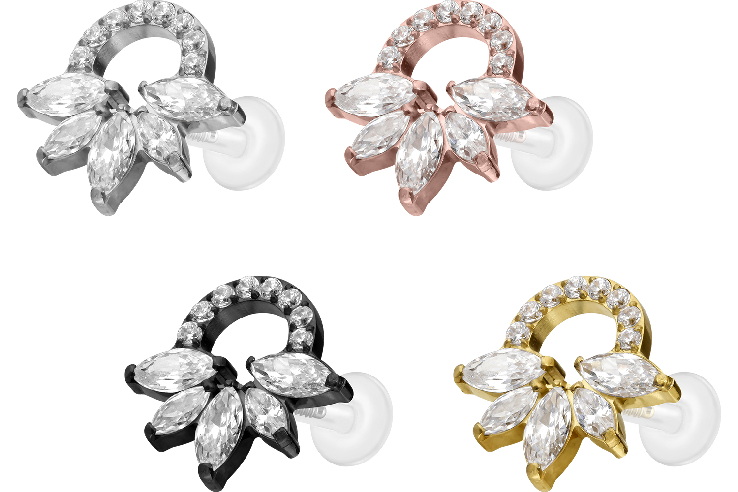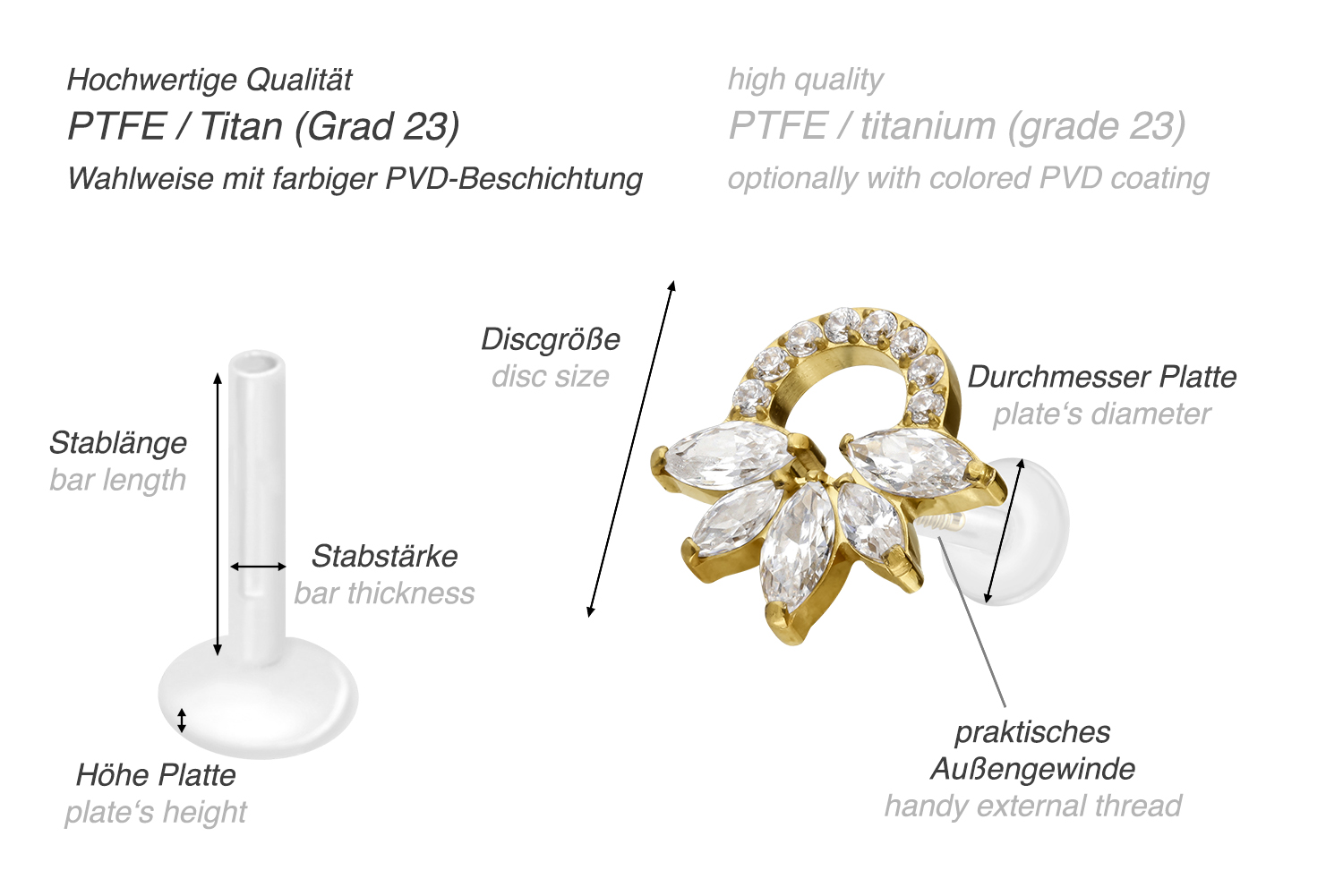 Dieses einzigartige Labret ist aus hochwertigem PTFE gefertigt, das ebenfalls unter dem Handelsnamen Teflon bekannt ist. Nur der Schraubaufsatz mit Außengewinde in Form einer Kristallrassel wurde anstelle dessen aus Titan gefertigt. Beide Materialien verfügen neben ihrer exzellenten Qualität auch über weitere nützliche Eigenschaften wie etwa besonders gute Hautveträglichkeit und Beständigkeit. PTFE betreffend kommen Flexibilität und Anpassungsfähigkeit hinzu. Letztere macht sich im Falle dieses Artikels dadurch bemerkbar, dass sich der Stab je nach Belieben mit einer gewöhnlichen Haushaltsschere kürzen lässt. Anschließend kann mithilfe des Aufsatzes ein neues Gewinde eingedreht werden, sodass weiterhin ein optimaler Halt gewährleistet wird. Zu den Vorzügen von Titan gehört Farbechtheit, die auch bei den farbigen Varianten mit PVD-Beschichtung gewährleistet wird. Das Labret hat eine Stabstärke von entweder 1,2 oder 1,6 mm und ist in den unten aufgeführten Stablängen erhältlich. Darüber hinaus kann sein 0,9 mm Innengewinde nach Belieben mit all unseren anderen Schraubaufsätzen mit entsprechendem Außengewinde kombiniert werden.