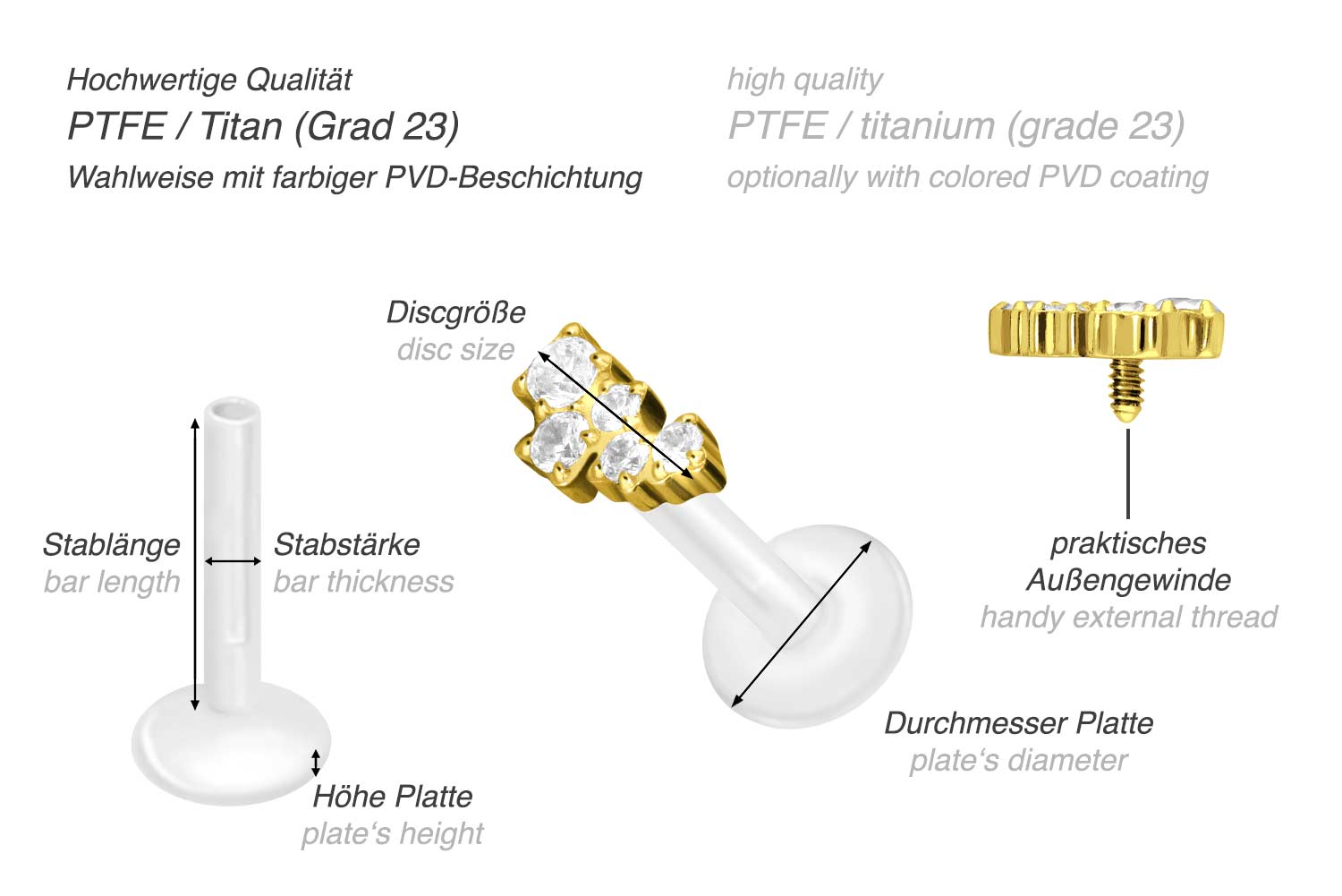 Dieses einzigartige Labret ist aus hochwertigem PTFE gefertigt, das ebenfalls unter dem Handelsnamen Teflon bekannt ist. Nur der Schraubaufsatz mit Außengewinde in Form einer funkelnden Kristallwolke wurde anstelle dessen aus Titan gefertigt. Beide Materialien verfügen neben ihrer exzellenten Qualität auch über weitere nützliche Eigenschaften wie etwa besonders gute Hautveträglichkeit und Beständigkeit. PTFE betreffend kommen Flexibilität und Anpassungsfähigkeit hinzu. Letztere macht sich im Falle dieses Artikels dadurch bemerkbar, dass sich der Stab je nach Belieben mit einer gewöhnlichen Haushaltsschere kürzen lässt. Anschließend kann mithilfe des Aufsatzes ein neues Gewinde eingedreht werden, sodass weiterhin ein optimaler Halt gewährleistet wird. Zu den Vorzügen von Titan gehört Farbechtheit, die auch bei den farbigen Varianten