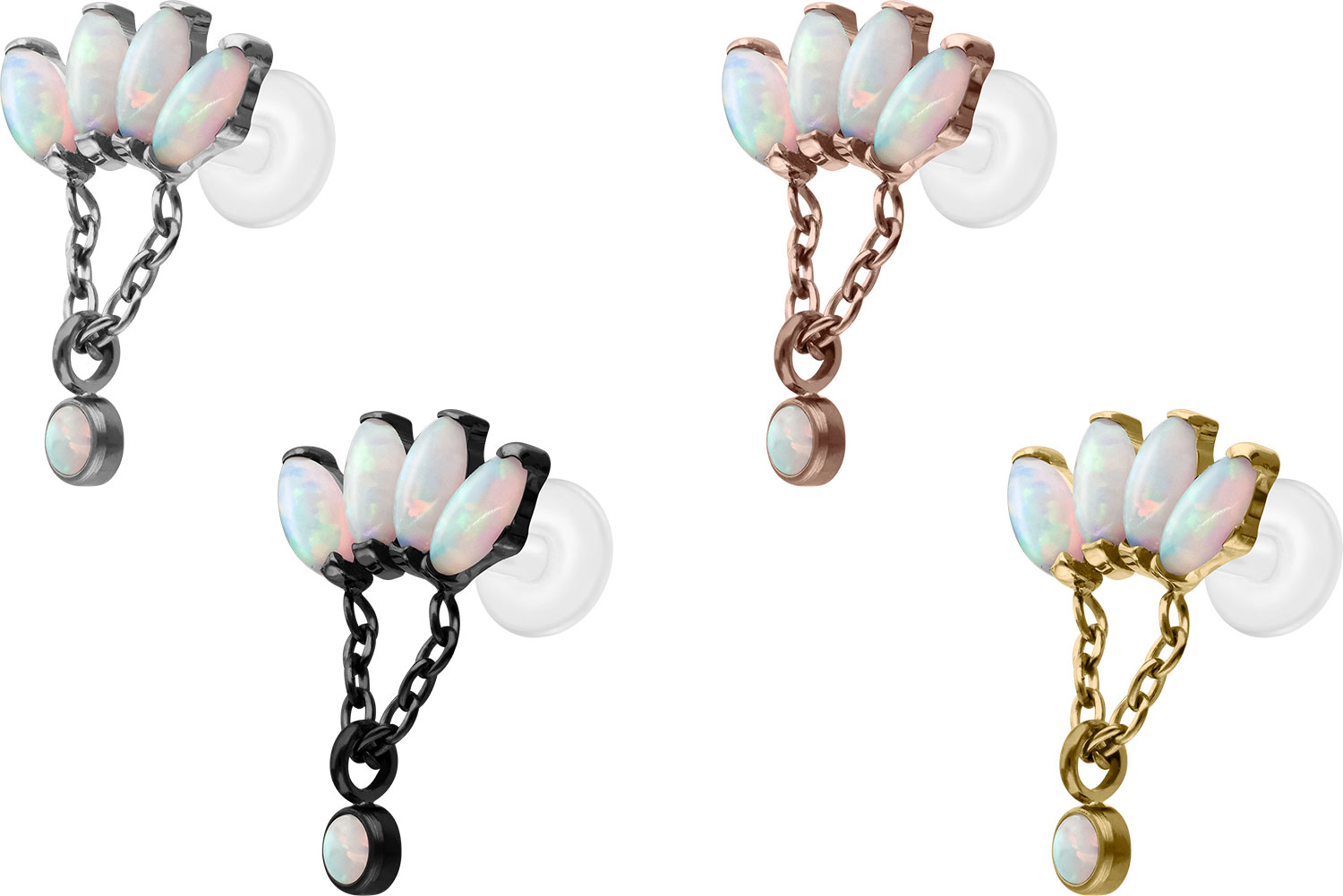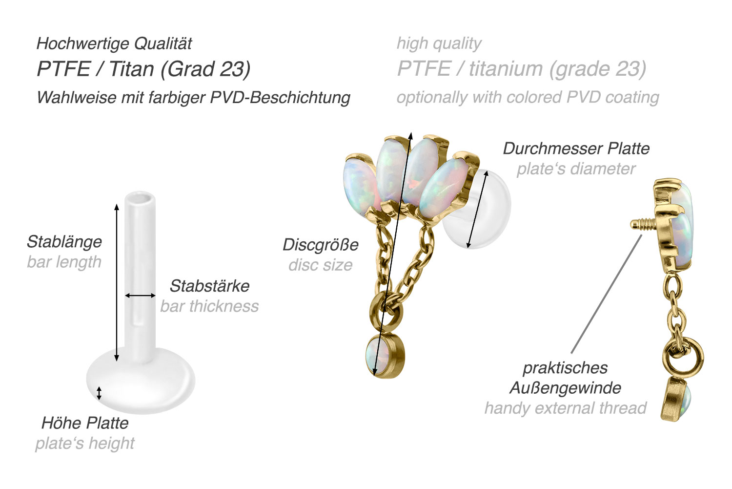 Dieses einzigartige Labret ist aus hochwertigem PTFE gefertigt, das ebenfalls unter dem Handelsnamen Teflon bekannt ist. Nur der Schraubaufsatz mit Außengewinde in Form einer Lotusblüte, an welcher eine Kette mit einem synthetischen Opal befestigt ist, wurde anstelle dessen aus Titan gefertigt. Beide Materialien verfügen neben ihrer exzellenten Qualität auch über weitere nützliche Eigenschaften wie etwa besonders gute Hautveträglichkeit und Beständigkeit. PTFE betreffend kommen Flexibilität und Anpassungsfähigkeit hinzu. Letztere macht sich im Falle dieses Artikels dadurch bemerkbar, dass sich der Stab je nach Belieben mit einer gewöhnlichen Haushaltsschere kürzen lässt. Anschließend kann mithilfe des Aufsatzes ein neues Gewinde eingedreht werden, sodass weiterhin ein optimaler Halt gewährleistet wird. Zu den Vorzügen von Titan gehört Farbechtheit, die auch bei den farbigen Varianten mit PVD-Beschichtung gewährleistet wird. Das Labret hat eine Stabstärke von entweder 1,2 oder 1,6 mm und ist in den unten aufgeführten Stablängen erhältlich. Darüber hinaus kann sein 0,9 mm Innengewinde nach Belieben mit all unseren anderen Schraubaufsätzen mit entsprechendem Außengewinde kombiniert werden.