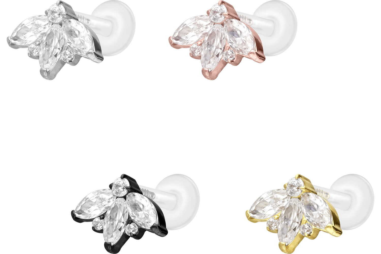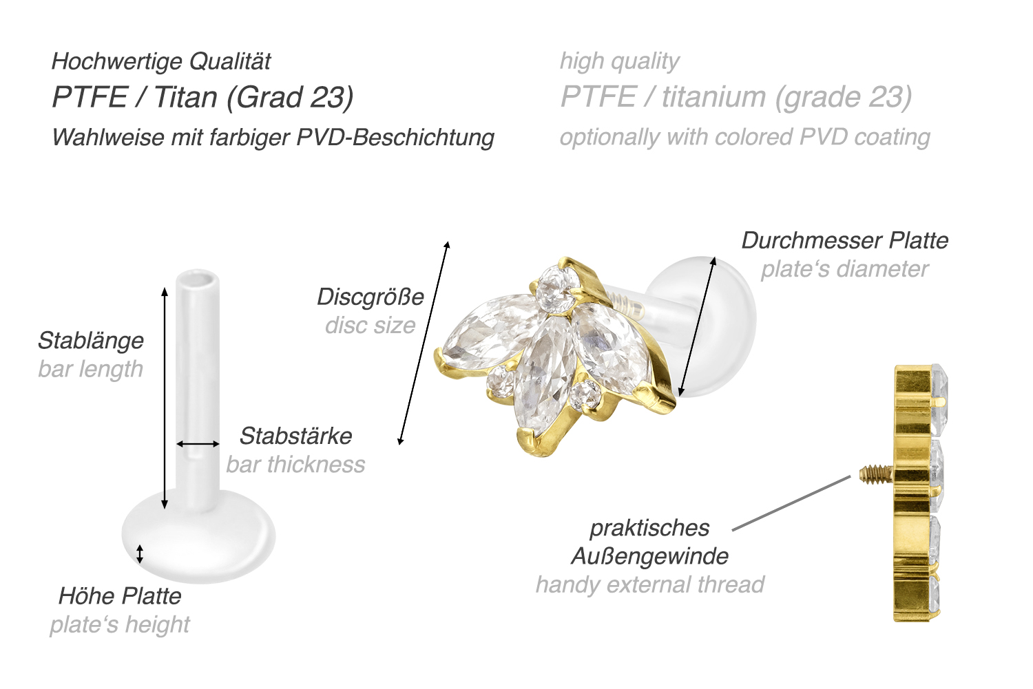 Dieses einzigartige Labret ist aus hochwertigem PTFE gefertigt, das ebenfalls unter dem Handelsnamen Teflon bekannt ist. Nur der Schraubaufsatz mit Außengewinde in Form einer Lotusblüte wurde anstelle dessen aus Titan gefertigt. Beide Materialien verfügen neben ihrer exzellenten Qualität auch über weitere nützliche Eigenschaften wie etwa besonders gute Hautveträglichkeit und Beständigkeit. PTFE betreffend kommen Flexibilität und Anpassungsfähigkeit hinzu. Letztere macht sich im Falle dieses Artikels dadurch bemerkbar, dass sich der Stab je nach Belieben mit einer gewöhnlichen Haushaltsschere kürzen lässt. Anschließend kann mithilfe des Aufsatzes ein neues Gewinde eingedreht werden, sodass weiterhin ein optimaler Halt gewährleistet wird. Zu den Vorzügen von Titan gehört Farbechtheit, die auch bei den farbigen Varianten mit PVD-Beschichtung gewährleistet wird. Das Labret hat eine Stabstärke von entweder 1,2 oder 1,6 mm und ist in den unten aufgeführten Stablängen erhältlich. Darüber hinaus kann sein 0,9 mm Innengewinde nach Belieben mit all unseren anderen Schraubaufsätzen mit entsprechendem Außengewinde kombiniert werden.