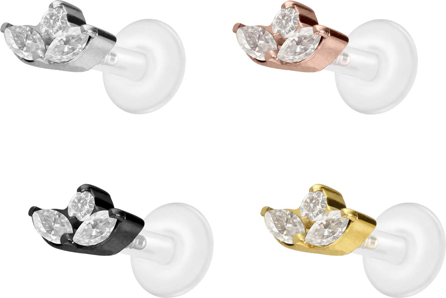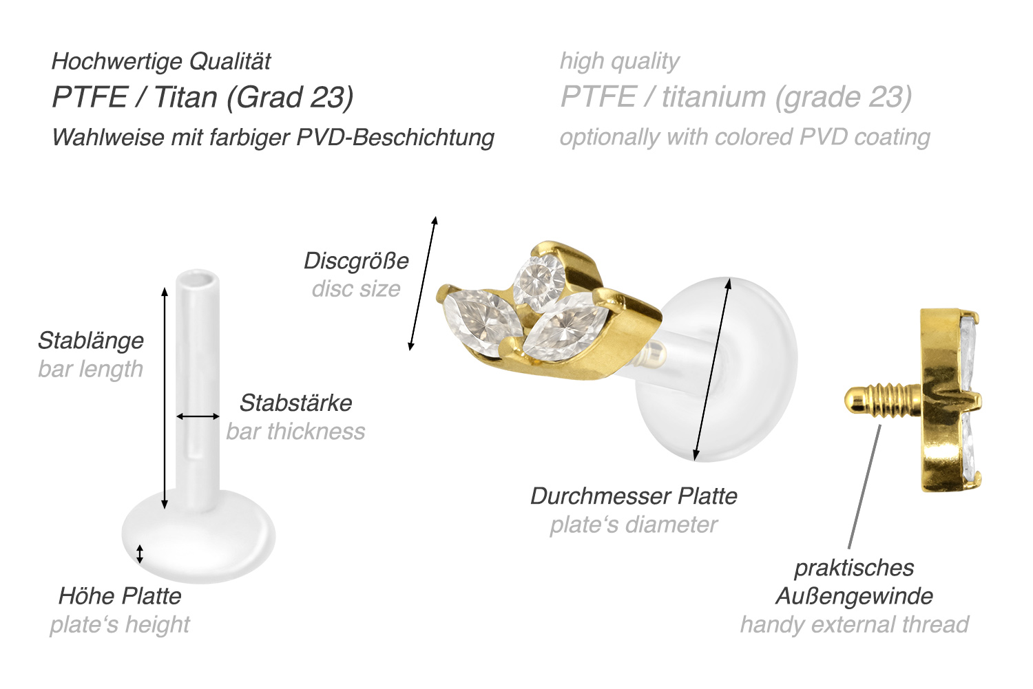 Dieses einzigartige Labret ist aus hochwertigem PTFE gefertigt, das ebenfalls unter dem Handelsnamen Teflon bekannt ist. Nur der Schraubaufsatz mit Außengewinde in Form einer Lotusblüte wurde anstelle dessen aus Titan gefertigt. Beide Materialien verfügen neben ihrer exzellenten Qualität auch über weitere nützliche Eigenschaften wie etwa besonders gute Hautveträglichkeit und Beständigkeit. PTFE betreffend kommen Flexibilität und Anpassungsfähigkeit hinzu. Letztere macht sich im Falle dieses Artikels dadurch bemerkbar, dass sich der Stab je nach Belieben mit einer gewöhnlichen Haushaltsschere kürzen lässt. Anschließend kann mithilfe des Aufsatzes ein neues Gewinde eingedreht werden, sodass weiterhin ein optimaler Halt gewährleistet wird. Zu den Vorzügen von Titan gehört Farbechtheit, die auch bei den farbigen Varianten mit PVD-Beschichtung gewährleistet wird. Das Labret hat eine Stabstärke von entweder 1,2 oder 1,6 mm und ist in den unten aufgeführten Stablängen erhältlich. Darüber hinaus kann sein 0,9 mm Innengewinde nach Belieben mit all unseren anderen Schraubaufsätzen mit entsprechendem Außengewinde kombiniert werden.