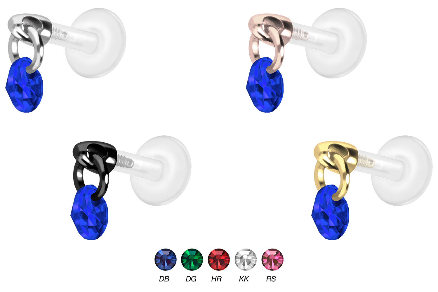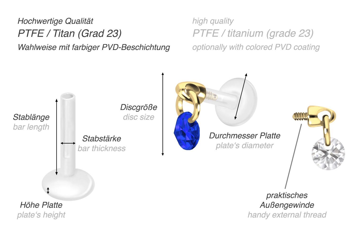 Dieses einzigartige Labret ist aus hochwertigem PTFE gefertigt, das ebenfalls unter dem Handelsnamen Teflon bekannt ist. Nur der Schraubaufsatz mit Außengewinde in Form eines funkelnden Kristalls wurde anstelle dessen aus Titan gefertigt. Beide Materialien verfügen neben ihrer exzellenten Qualität auch über weitere nützliche Eigenschaften wie etwa besonders gute Hautveträglichkeit und Beständigkeit. PTFE betreffend kommen Flexibilität und Anpassungsfähigkeit hinzu. Letztere macht sich im Falle dieses Artikels dadurch bemerkbar, dass sich der Stab je nach Belieben mit einer gewöhnlichen Haushaltsschere kürzen lässt. Anschließend kann mithilfe des Aufsatzes ein neues Gewinde eingedreht werden, sodass weiterhin ein optimaler Halt gewährleistet wird. Zu den Vorzügen von Titan gehört Farbechtheit, die auch bei den farbigen Varianten mit PVD-Beschichtung gewährleistet wird. Das Labret hat eine Stabstärke von entweder 1,2 oder 1,6 mm und ist in den unten aufgeführten Stablängen erhältlich. Darüber hinaus kann sein 0,9 mm Innengewinde nach Belieben mit all unseren anderen Schraubaufsätzen mit entsprechendem Außengewinde kombiniert werden.