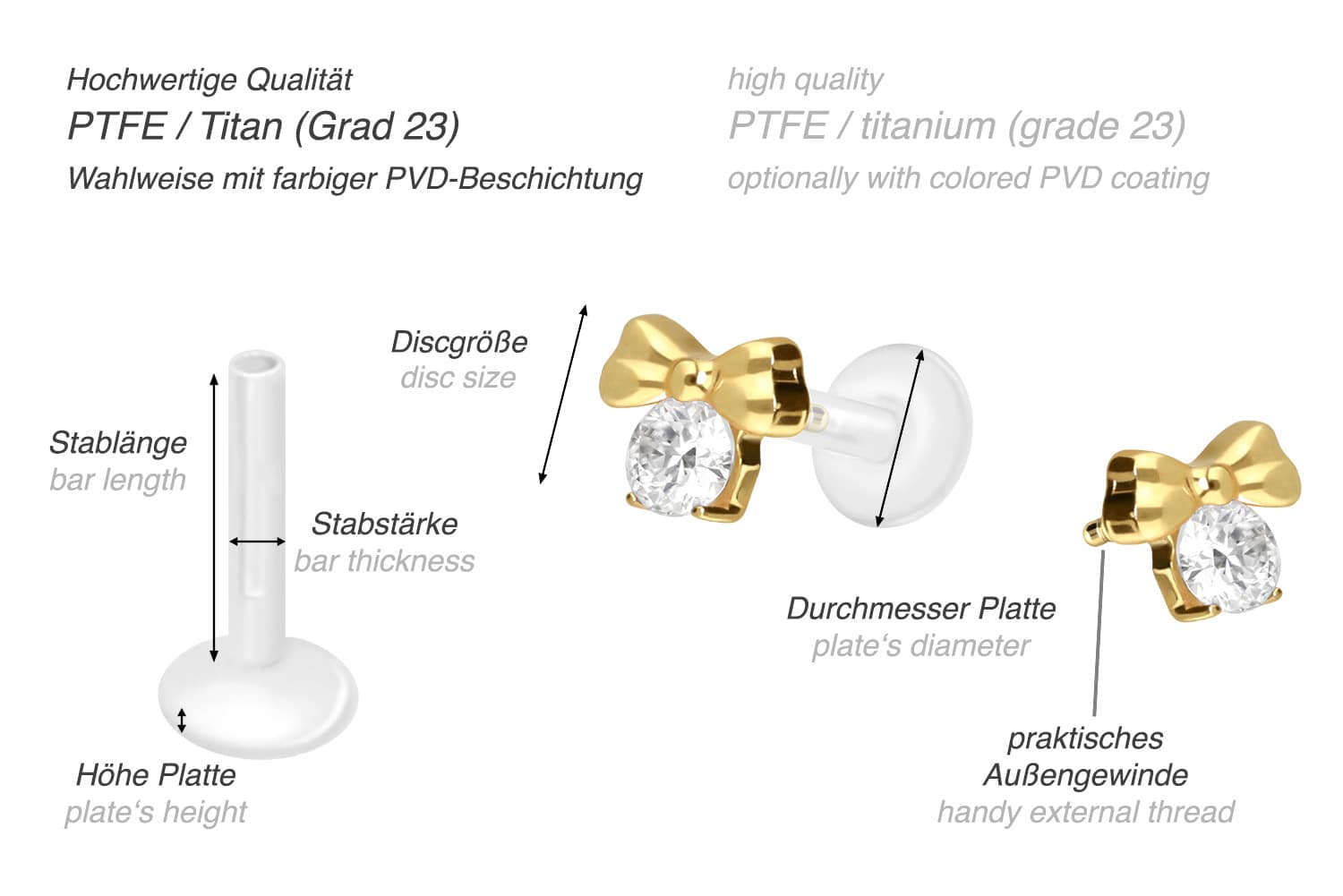 Dieses einzigartige Labret ist aus hochwertigem PTFE gefertigt, das ebenfalls unter dem Handelsnamen Teflon bekannt ist. Nur der Schraubaufsatz mit Außengewinde in Form einer Schleife, welche mit einem funkelnden Kristall verziehrt ist, wurde anstelle dessen aus Titan gefertigt. Beide Materialien verfügen neben ihrer exzellenten Qualität auch über weitere nützliche Eigenschaften wie etwa besonders gute Hautveträglichkeit und Beständigkeit. PTFE betreffend kommen Flexibilität und Anpassungsfähigkeit hinzu. Letztere macht sich im Falle dieses Artikels dadurch bemerkbar, dass sich der Stab je nach Belieben mit einer gewöhnlichen Haushaltsschere kürzen lässt. Anschließend kann mithilfe des Aufsatzes ein neues Gewinde eingedreht werden, sodass weiterhin ein optimaler Halt gewährleistet wird. Zu den Vorzügen von Titan gehört Farbechtheit, die auch bei den farbigen Varianten