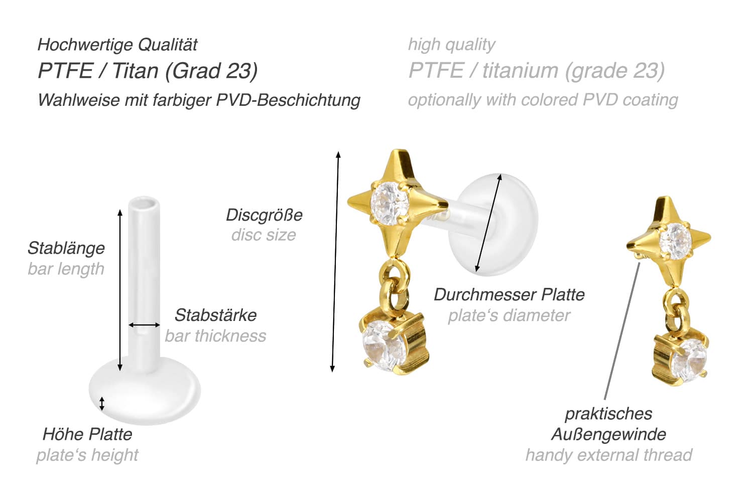 Dieses einzigartige Labret ist aus hochwertigem PTFE gefertigt, das ebenfalls unter dem Handelsnamen Teflon bekannt ist. Nur der Schraubaufsatz mit Außengewinde in Form eines Sterns, an welchem ein funkelnder Kristall befestigt ist, wurde anstelle dessen aus Titan gefertigt. Beide Materialien verfügen neben ihrer exzellenten Qualität auch über weitere nützliche Eigenschaften wie etwa besonders gute Hautveträglichkeit und Beständigkeit. PTFE betreffend kommen Flexibilität und Anpassungsfähigkeit hinzu. Letztere macht sich im Falle dieses Artikels dadurch bemerkbar, dass sich der Stab je nach Belieben mit einer gewöhnlichen Haushaltsschere kürzen lässt. Anschließend kann mithilfe des Aufsatzes ein neues Gewinde eingedreht werden, sodass weiterhin ein optimaler Halt gewährleistet wird. Zu den Vorzügen von Titan gehört Farbechtheit, die auch bei den farbigen Varianten mit PVD-Beschichtung gewährleistet wird. Das Labret hat eine Stabstärke von entweder 1,2 oder 1,6 mm und ist in den unten aufgeführten Stablängen erhältlich. Darüber hinaus kann sein 0,9 mm Innengewinde nach Belieben mit all unseren anderen Schraubaufsätzen mit entsprechendem Außengewinde kombiniert werden.