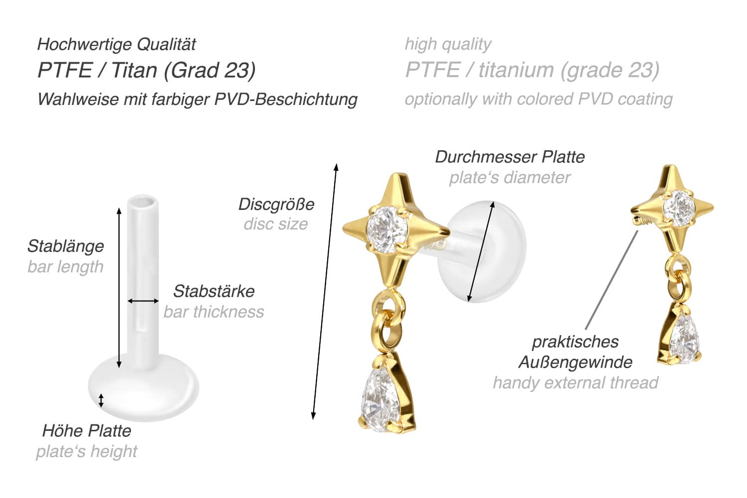 Dieses einzigartige Labret ist aus hochwertigem PTFE gefertigt, das ebenfalls unter dem Handelsnamen Teflon bekannt ist. Nur der Schraubaufsatz mit Außengewinde in Form eines Sterns, an welchem ein funkelnder Kristalltropfen befestigt ist, wurde anstelle dessen aus Titan gefertigt. Beide Materialien verfügen neben ihrer exzellenten Qualität auch über weitere nützliche Eigenschaften wie etwa besonders gute Hautveträglichkeit und Beständigkeit. PTFE betreffend kommen Flexibilität und Anpassungsfähigkeit hinzu. Letztere macht sich im Falle dieses Artikels dadurch bemerkbar, dass sich der Stab je nach Belieben mit einer gewöhnlichen Haushaltsschere kürzen lässt. Anschließend kann mithilfe des Aufsatzes ein neues Gewinde eingedreht werden, sodass weiterhin ein optimaler Halt gewährleistet wird. Zu den Vorzügen von Titan gehört Farbechtheit, die auch bei den farbigen Varianten mit PVD-Beschichtung gewährleistet wird. Das Labret hat eine Stabstärke von entweder 1,2 oder 1,6 mm und ist in den unten aufgeführten Stablängen erhältlich. Darüber hinaus kann sein 0,9 mm Innengewinde nach Belieben mit all unseren anderen Schraubaufsätzen mit entsprechendem Außengewinde kombiniert werden.