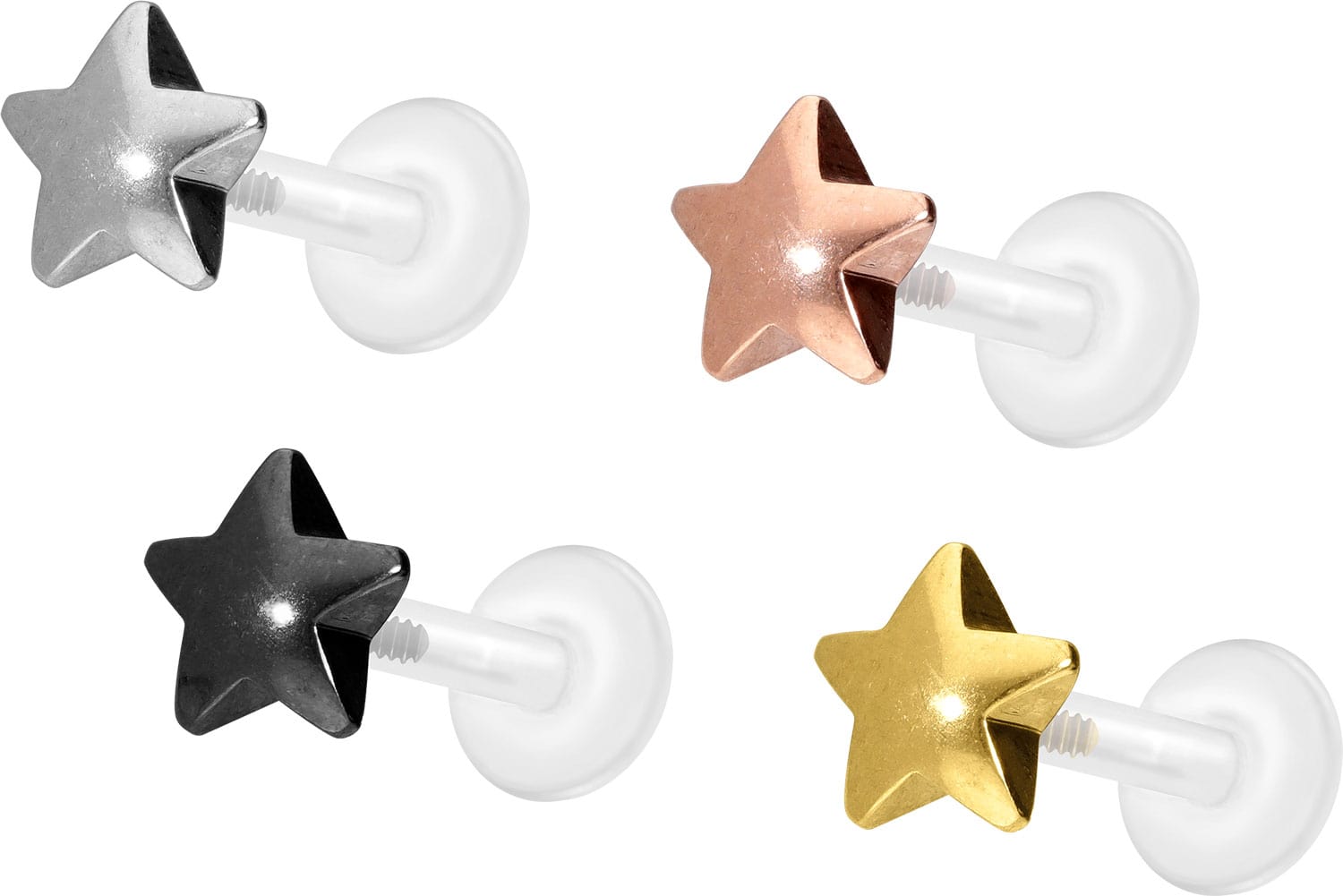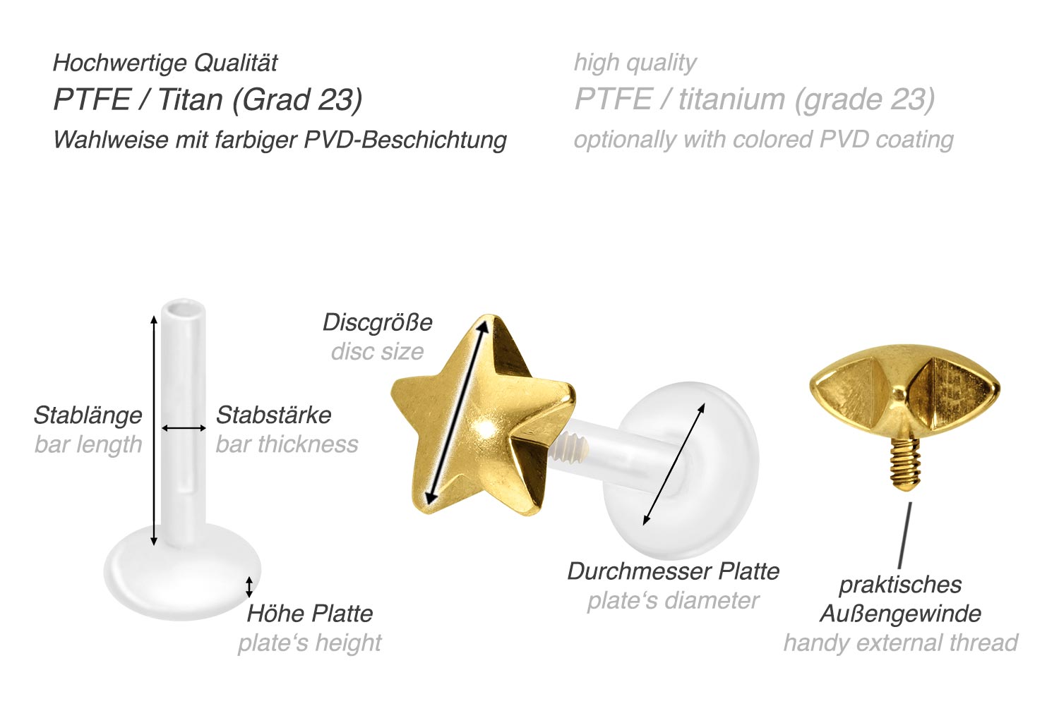 Dieses einzigartige Labret ist aus hochwertigem PTFE gefertigt, das ebenfalls unter dem Handelsnamen Teflon bekannt ist. Nur der Schraubaufsatz mit Außengewinde in Form eines Sterns wurde anstelle dessen aus Titan gefertigt. Beide Materialien verfügen neben ihrer exzellenten Qualität auch über weitere nützliche Eigenschaften wie etwa besonders gute Hautveträglichkeit und Beständigkeit. PTFE betreffend kommen Flexibilität und Anpassungsfähigkeit hinzu. Letztere macht sich im Falle dieses Artikels dadurch bemerkbar, dass sich der Stab je nach Belieben mit einer gewöhnlichen Haushaltsschere kürzen lässt. Anschließend kann mithilfe des Aufsatzes ein neues Gewinde eingedreht werden, sodass weiterhin ein optimaler Halt gewährleistet wird. Zu den Vorzügen von Titan gehört Farbechtheit, die auch bei den farbigen Varianten mit PVD-Beschichtung gewährleistet wird. Das Labret hat eine Stabstärke von entweder 1,2 oder 1,6 mm und ist in den unten aufgeführten Stablängen erhältlich. Darüber hinaus kann sein 0,9 mm Innengewinde nach Belieben mit all unseren anderen Schraubaufsätzen mit entsprechendem Außengewinde kombiniert werden.