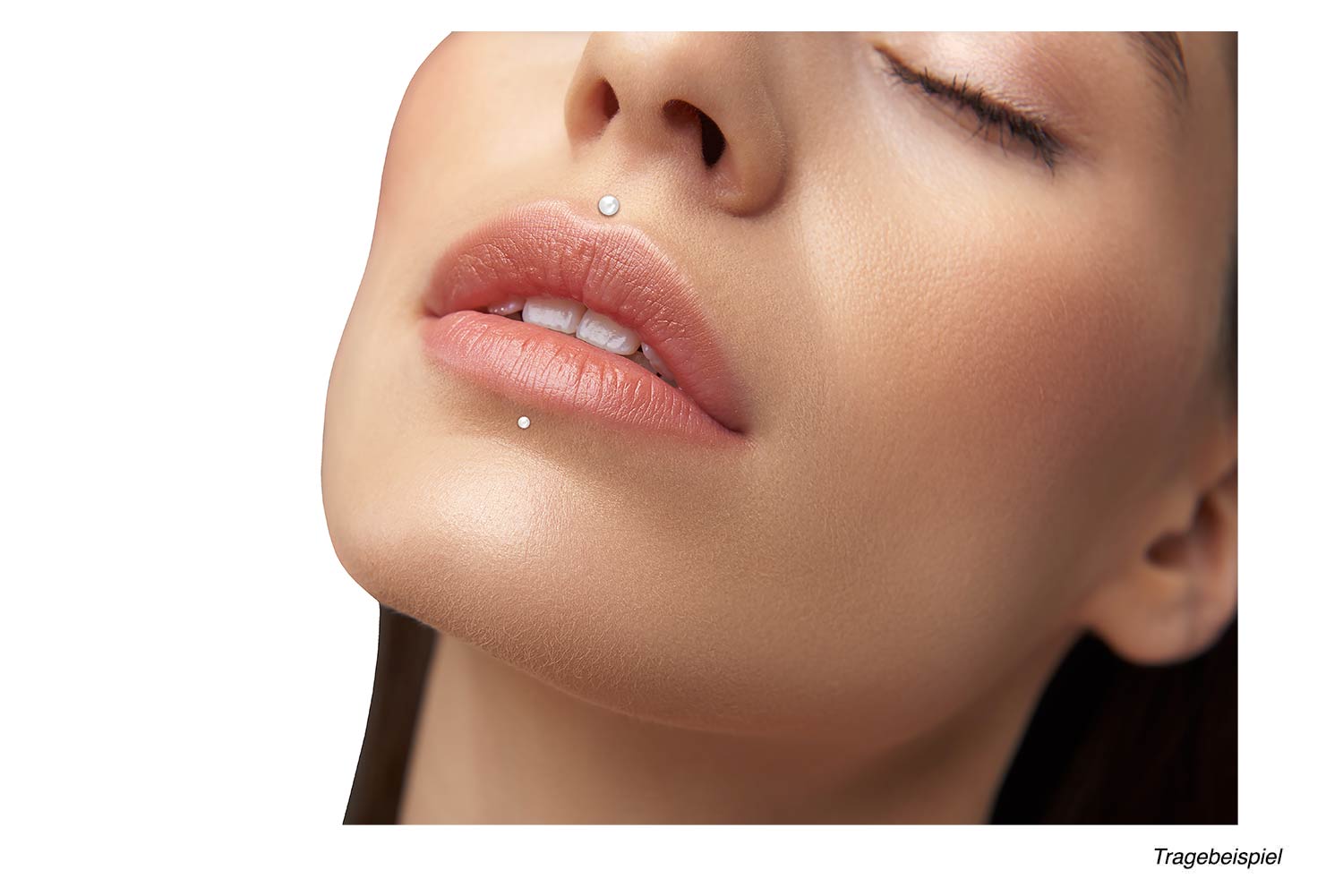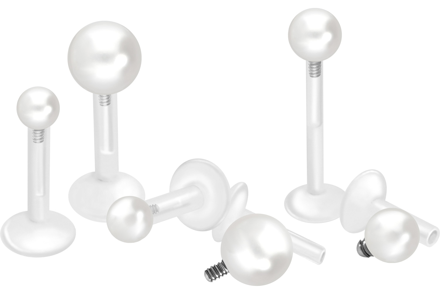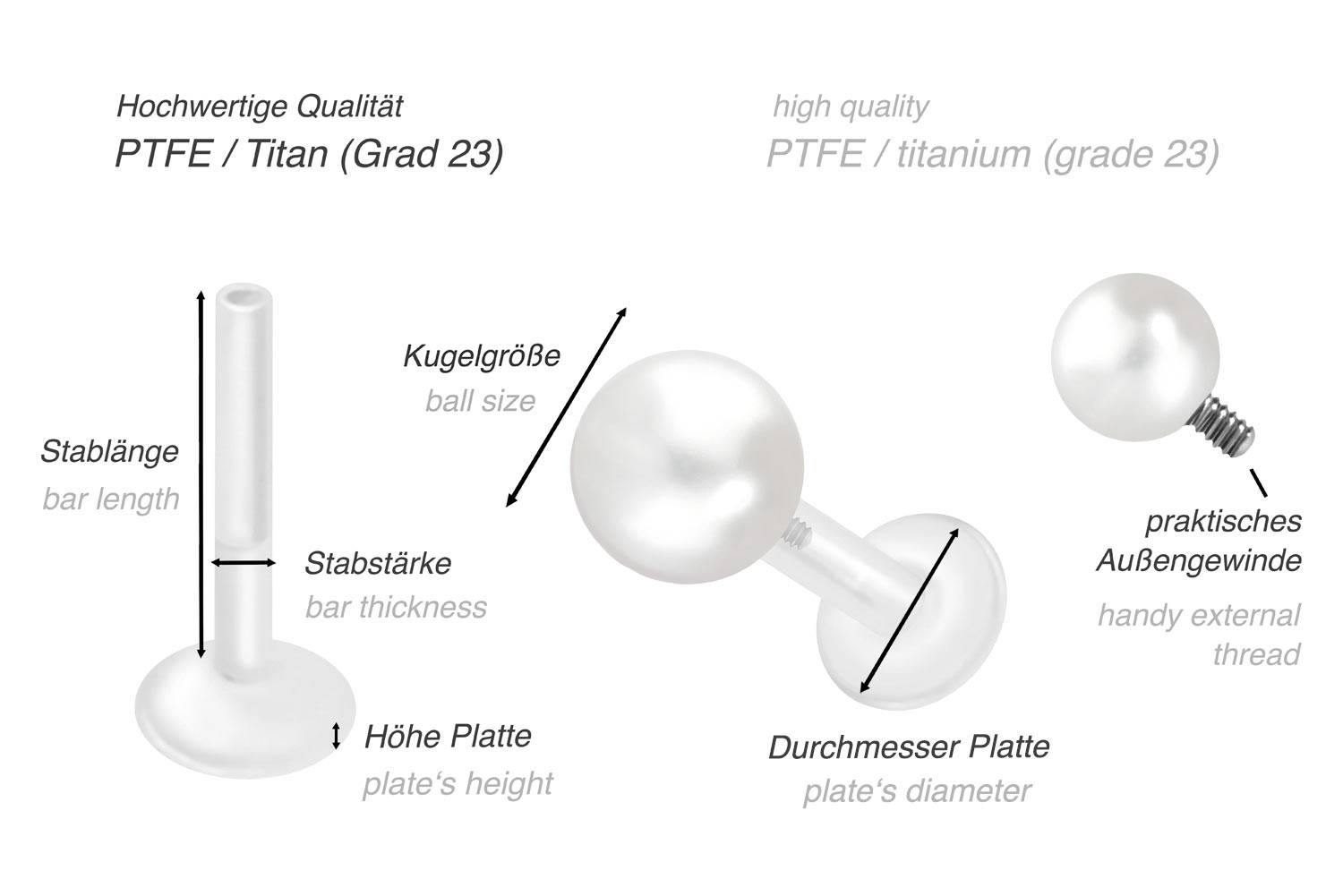 Dieses einzigartige Labret ist aus hochwertigem PTFE gefertigt, das ebenfalls unter dem Handelsnamen Teflon bekannt ist. Nur das Außengewinde des Schraubaufsatzes wurde anstelle dessen aus Titan gefertigt. Eine wunderschöne synthetische Perle lässt das Labret in voller Pracht erstrahlen. Die Materialien verfügen neben ihrer exzellenten Qualität auch über weitere nützliche Eigenschaften wie etwa besonders gute Hautveträglichkeit und Beständigkeit. PTFE betreffend kommen Flexibilität und Anpassungsfähigkeit hinzu. Letztere macht sich im Falle dieses Artikels dadurch bemerkbar, dass sich der Stab je nach Belieben mit einer gewöhnlichen Haushaltsschere kürzen lässt. Anschließend kann mithilfe des Aufsatzes ein neues Gewinde eingedreht werden, sodass weiterhin ein optimaler Halt gewährleistet wird. Das Labret hat eine Stabstärke von entweder 1,2 oder 1,6 mm und ist in den