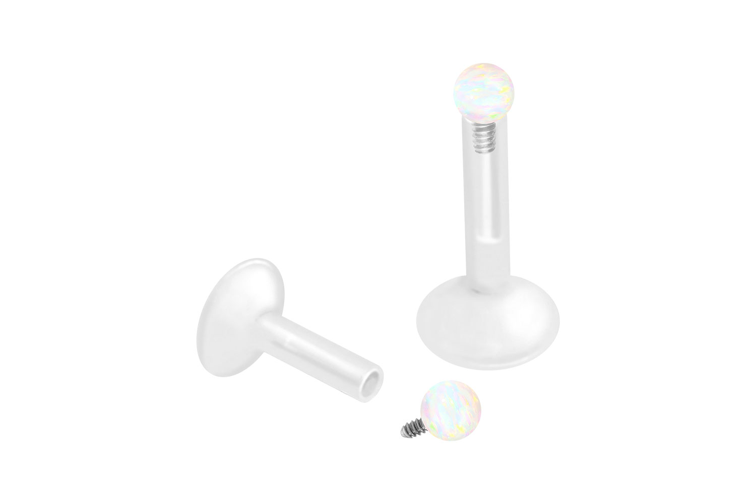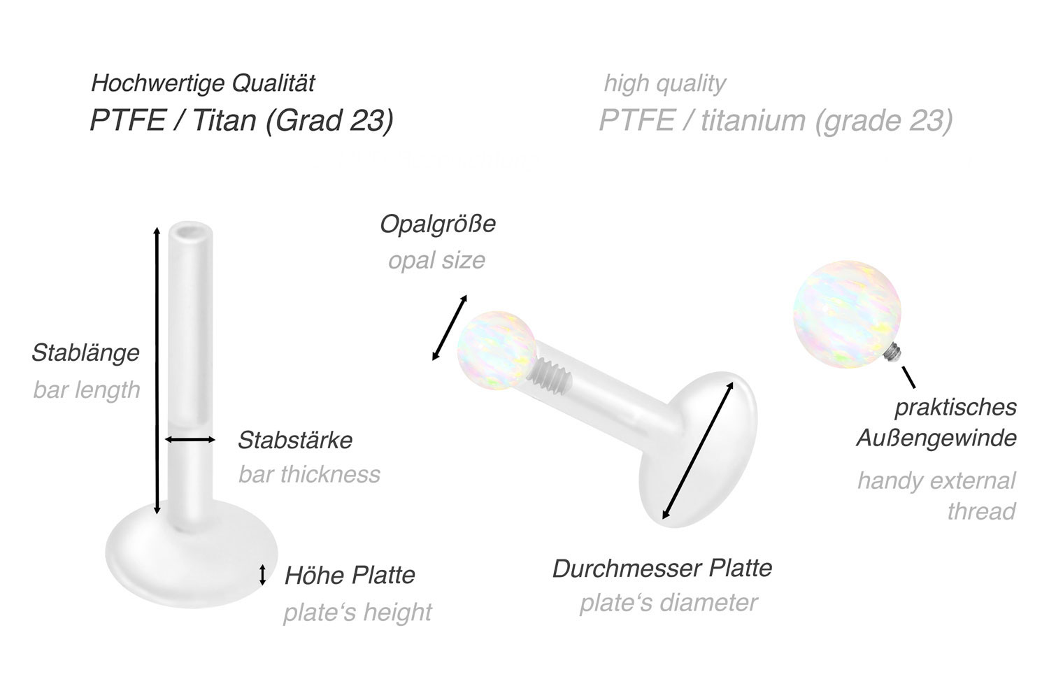 Dieses einzigartige Labret ist aus hochwertigem PTFE gefertigt, das ebenfalls unter dem Handelsnamen Teflon bekannt ist. Nur das Außengewinde des Schraubaufsatzes wurde anstelle dessen aus Titan gefertigt. Ein wunderschön schimmernder synthetischer Opal lässt das Labret in voller Pracht erstrahlen. Die Materialien verfügen neben ihrer exzellenten Qualität auch über weitere nützliche Eigenschaften wie etwa besonders gute Hautveträglichkeit und Beständigkeit. PTFE betreffend kommen Flexibilität und Anpassungsfähigkeit hinzu. Letztere macht sich im Falle dieses Artikels dadurch bemerkbar, dass sich der Stab je nach Belieben mit einer gewöhnlichen Haushaltsschere kürzen lässt. Anschließend kann mithilfe des Aufsatzes ein neues Gewinde eingedreht werden, sodass weiterhin ein optimaler Halt gewährleistet wird. Das Labret hat eine Stabstärke von entweder 1,2 oder 1,6 mm und ist in den