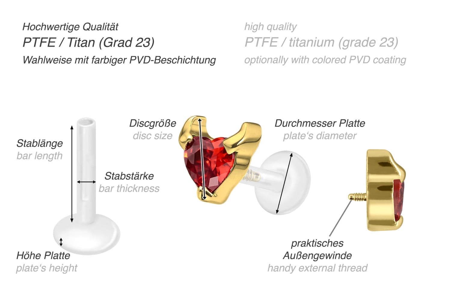 Dieses einzigartige Labret ist aus hochwertigem PTFE gefertigt, das ebenfalls unter dem Handelsnamen Teflon bekannt ist. Nur der Schraubaufsatz mit Außengewinde in Form eines Teufelsherzens wurde anstelle dessen aus Titan gefertigt. Beide Materialien verfügen neben ihrer exzellenten Qualität auch über weitere nützliche Eigenschaften wie etwa besonders gute Hautveträglichkeit und Beständigkeit. PTFE betreffend kommen Flexibilität und Anpassungsfähigkeit hinzu. Letztere macht sich im Falle dieses Artikels dadurch bemerkbar, dass sich der Stab je nach Belieben mit einer gewöhnlichen Haushaltsschere kürzen lässt. Anschließend kann mithilfe des Aufsatzes ein neues Gewinde eingedreht werden, sodass weiterhin ein optimaler Halt gewährleistet wird. Zu den Vorzügen von Titan gehört Farbechtheit, die auch bei den farbigen Varianten mit PVD-Beschichtung gewährleistet wird. Das Labret hat eine Stabstärke von entweder 1,2 oder 1,6 mm und ist in den unten aufgeführten Stablängen erhältlich. Darüber hinaus kann sein 0,9 mm Innengewinde nach Belieben mit all unseren anderen Schraubaufsätzen mit entsprechendem Außengewinde kombiniert werden.