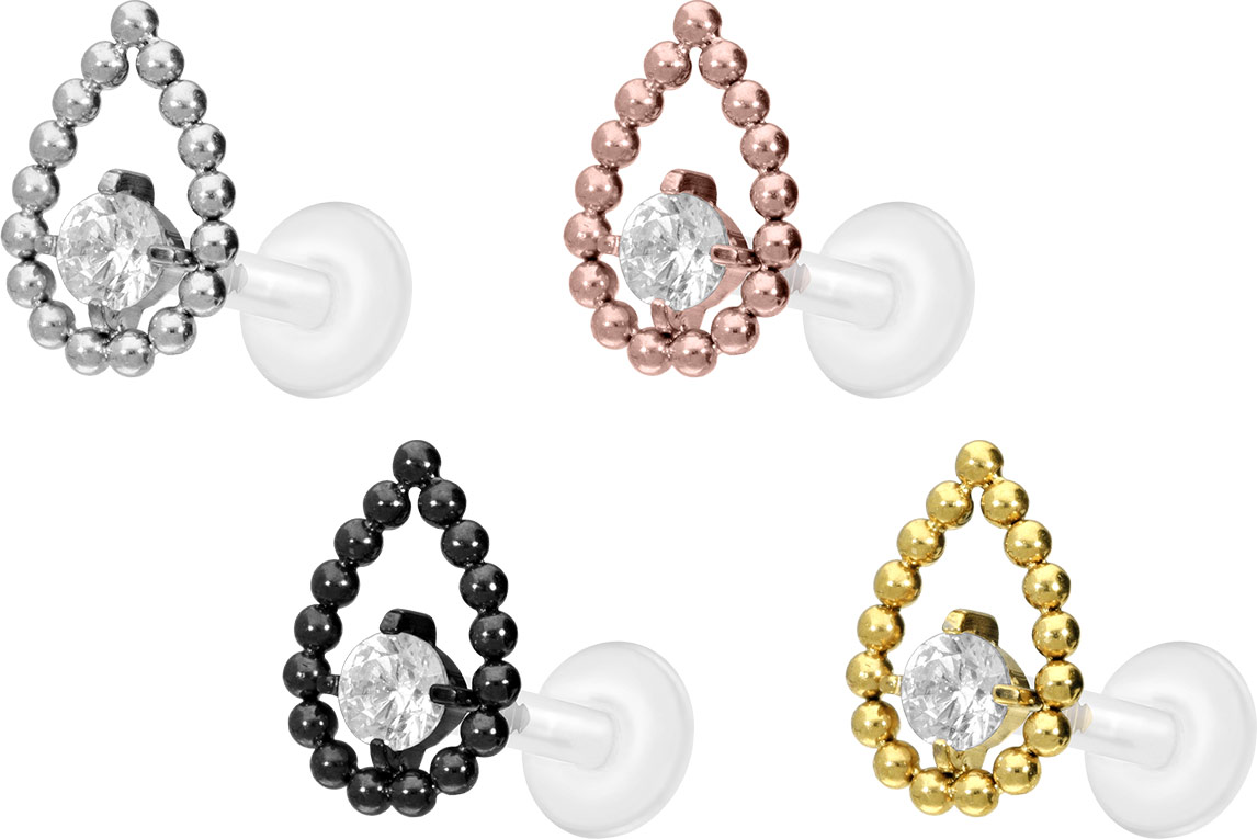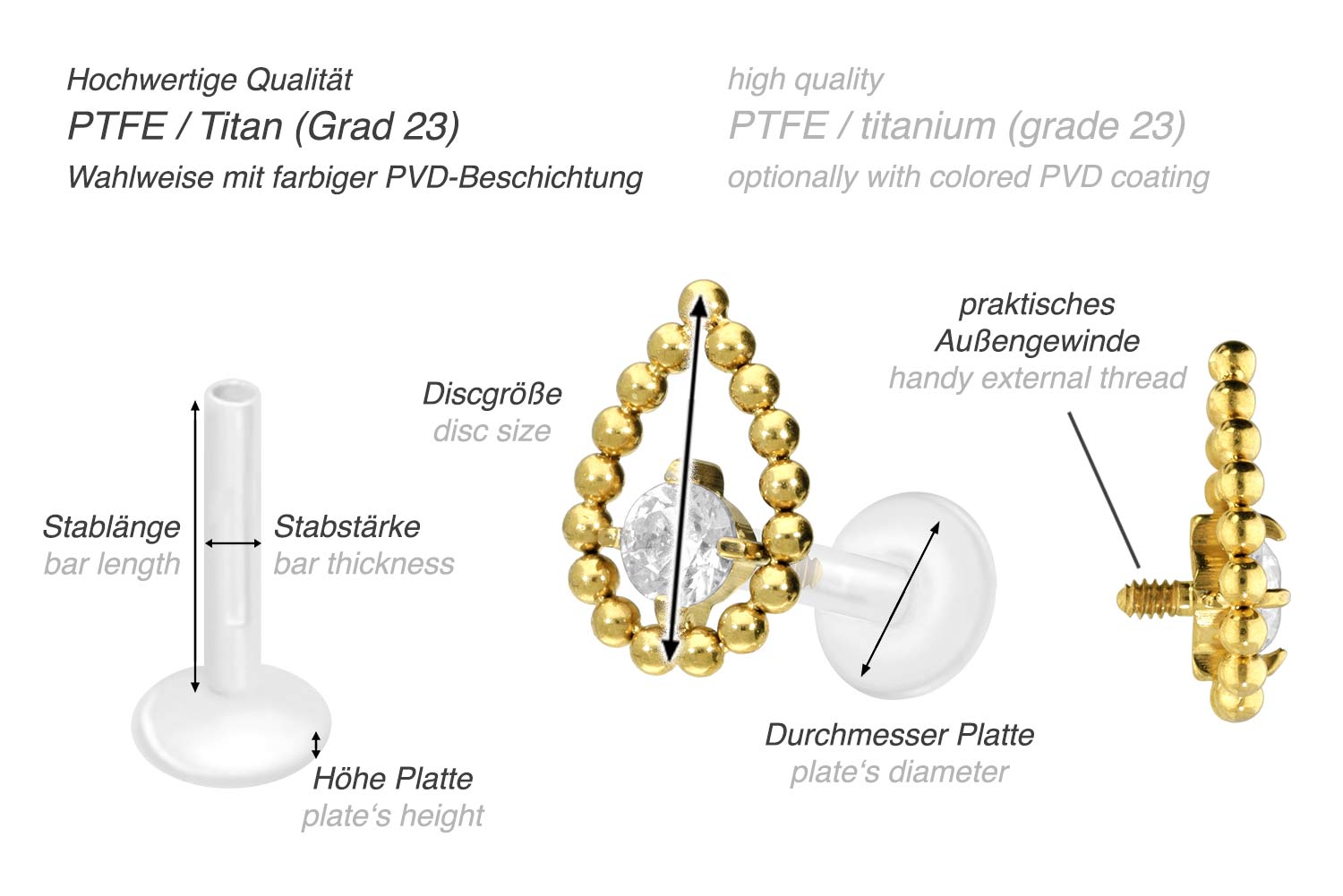 Dieses einzigartige Labret ist aus hochwertigem PTFE gefertigt, das ebenfalls unter dem Handelsnamen Teflon bekannt ist. Nur der Schraubaufsatz mit Außengewinde in Form eines Tropfens, welcher mit einem funkelnden Kristall verziehrt ist, wurde anstelle dessen aus Titan gefertigt. Beide Materialien verfügen neben ihrer exzellenten Qualität auch über weitere nützliche Eigenschaften wie etwa besonders gute Hautveträglichkeit und Beständigkeit. PTFE betreffend kommen Flexibilität und Anpassungsfähigkeit hinzu. Letztere macht sich im Falle dieses Artikels dadurch bemerkbar, dass sich der Stab je nach Belieben mit einer gewöhnlichen Haushaltsschere kürzen lässt. Anschließend kann mithilfe des Aufsatzes ein neues Gewinde eingedreht werden, sodass weiterhin ein optimaler Halt gewährleistet wird. Zu den Vorzügen von Titan gehört Farbechtheit, die auch bei den farbigen Varianten mit PVD-Beschichtung gewährleistet wird. Das Labret hat eine Stabstärke von entweder 1,2 oder 1,6 mm und ist in den unten aufgeführten Stablängen erhältlich. Darüber hinaus kann sein 0,9 mm Innengewinde nach Belieben mit all unseren anderen Schraubaufsätzen mit entsprechendem Außengewinde kombiniert werden.
